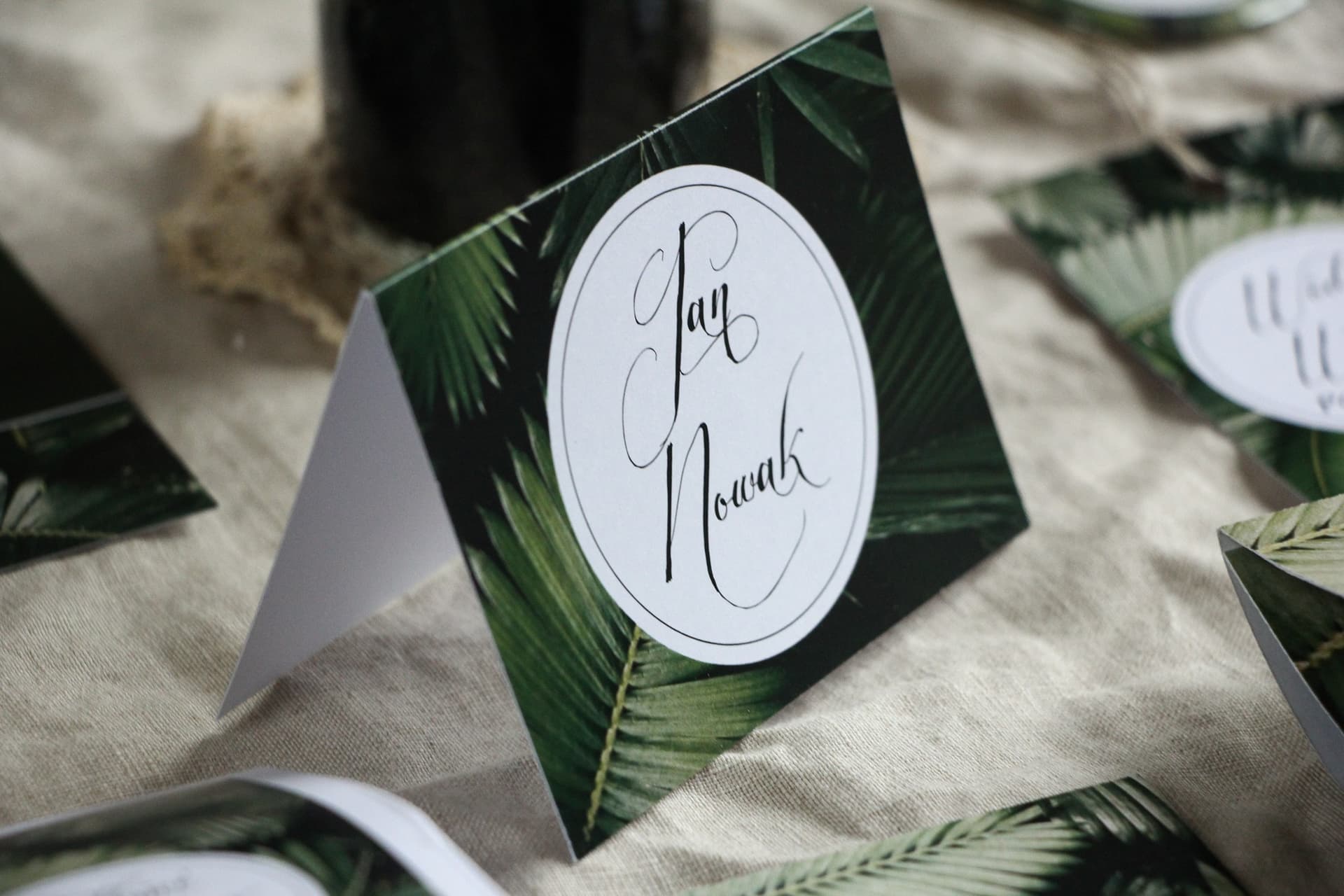 Hochzeits-Tischkarten Botanik Nr. 2 – Namenskarten mit Bananenblatt-Motiv