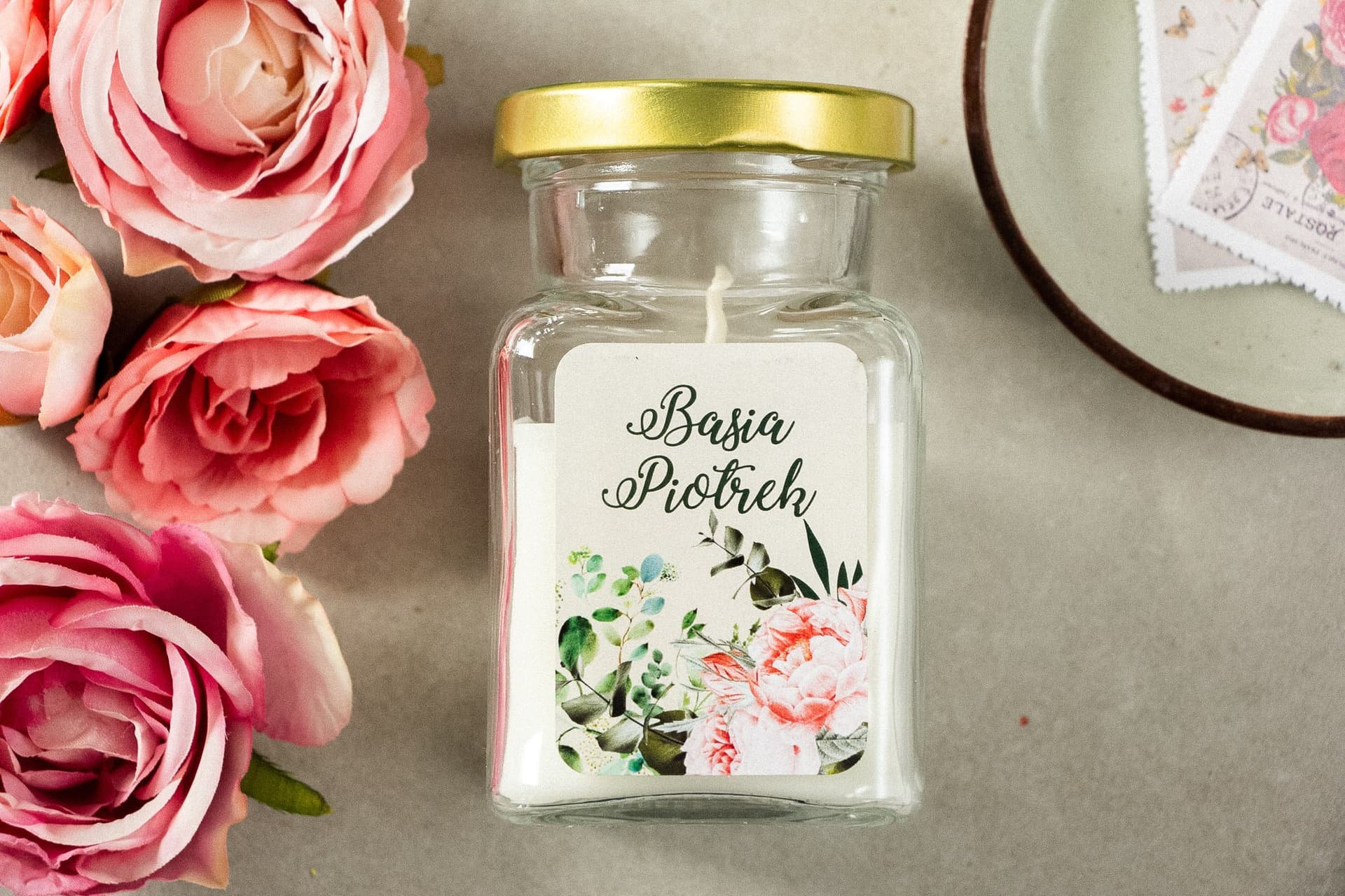 Begeistern Sie Ihre Hochzeitsgäste mit einem exklusiven Geschenk, das lange in Erinnerung bleiben wird. Unsere eleganten, personalisierten Duftkerzen im Glas, verziert mit einem dezenten Motiv aus Rosen und Eukalyptus, sind die ideale Art, Ihre Dankbarkeit zu zeigen. Ein zarter floraler Duft und der goldene Deckel verleihen dem Ganzen einen luxuriösen Charakter und schaffen ein unvergessliches Souvenir an Ihren besonderen Tag. Bestellen Sie noch heute und schenken Sie Ihren Gästen mehr als nur ein Präsent – schenken Sie ihnen eine wertvolle Erinnerung.