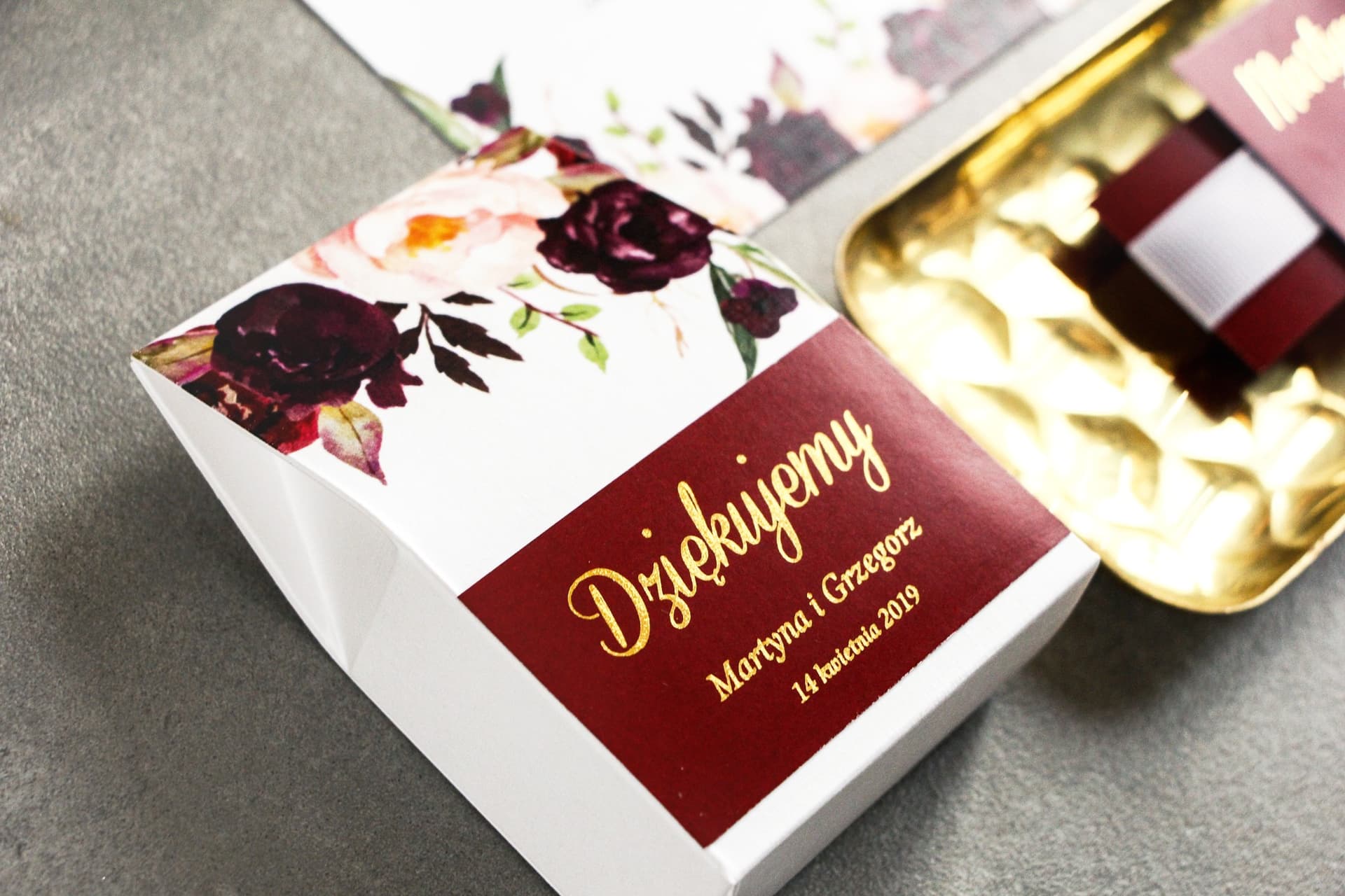 Elegante Gastgeschenke-Boxen mit Karamellbonbons, burgunderrote Blüten und Goldfolierung | Lotaro Nr. 3