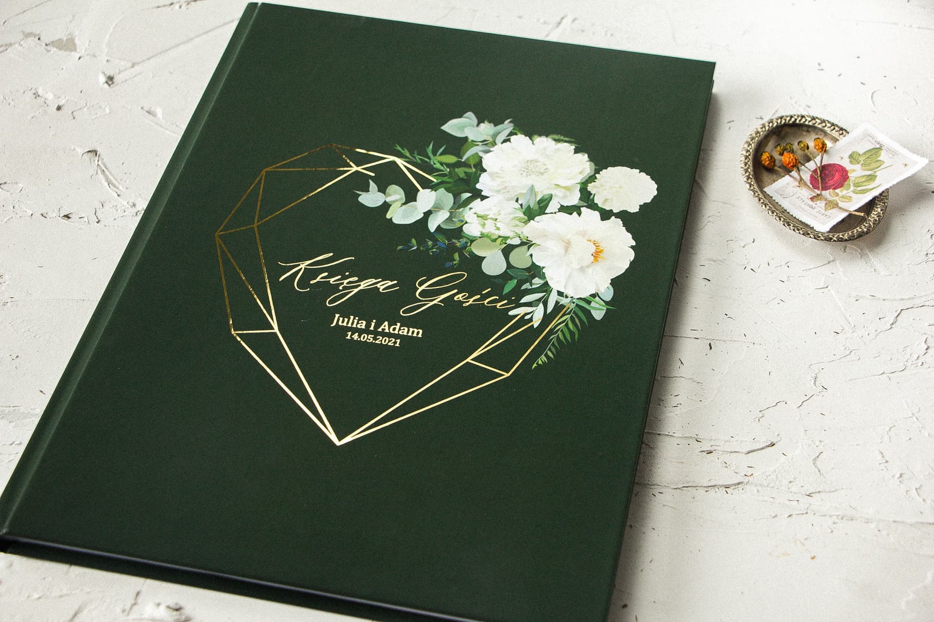 Ein elegantes Hochzeitsgästebuch aus der Kollektion Szafirowe ist ein Souvenir, das Jahre überdauert. Es besticht durch tiefes Flaschengrün, eine Komposition aus weißen Pfingstrosen und Dahlien sowie ein glänzendes, vergoldetes geometrisches Herz. Im A4-Format, mit bis zu 100 weißen Seiten, bietet es Platz für die Einträge all Ihrer Liebsten. Wir bieten eine vollständige Personalisierung des Covers an, damit es perfekt zu Ihrem Tag passt. Erstellen Sie mit uns ein einzigartiges Erinnerungsalbum, das Sie noch nach Jahren mit Stolz durchblättern werden. Bestellen Sie jetzt und halten Sie die Magie Ihrer Hochzeit für immer fest!
