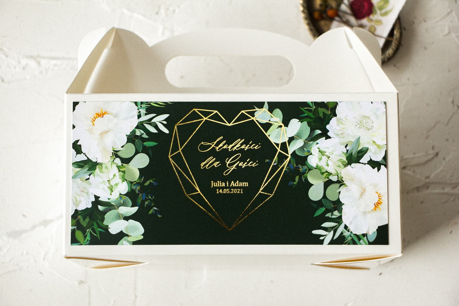 Die Farbgebung spielt eine Schlüsselrolle beim Aufbau der Hochzeitsatmosphäre. Salbeigrün oder tiefes Dunkelgrün (Butelkowa Zieleń) wird seit Jahren mit Luxus, Harmonie und Eleganz assoziiert. In Kombination mit glänzendem Gold entsteht ein perfektes Duo, das sich in die neuesten Hochzeitstrends im Glamour-Stil und Modern Classic einfügt. Unsere veredelten Tortenschachteln wurden genau in diesem Geist entworfen. Das Herzstück der Komposition ist ein goldenes, geometrisches Herz – ein modernes Symbol der Liebe, das die Blicke auf sich zieht und dem Ganzen Charakter verleiht. Den Hintergrund bildet eine zarte Aquarellgrafik mit weißen Pfingstrosen, Dahlien und Hortensien. Diese edlen Blumen bringen ein Element von Romantik und Frische in das Design und schaffen eine perfekte Balance zwischen Moderne und Tradition. Jedes Detail wurde sorgfältig durchdacht, um eine kohärente und begeisternde Komposition zu schaffen, die zu einer schönen Visitenkarte Ihres Festes wird.