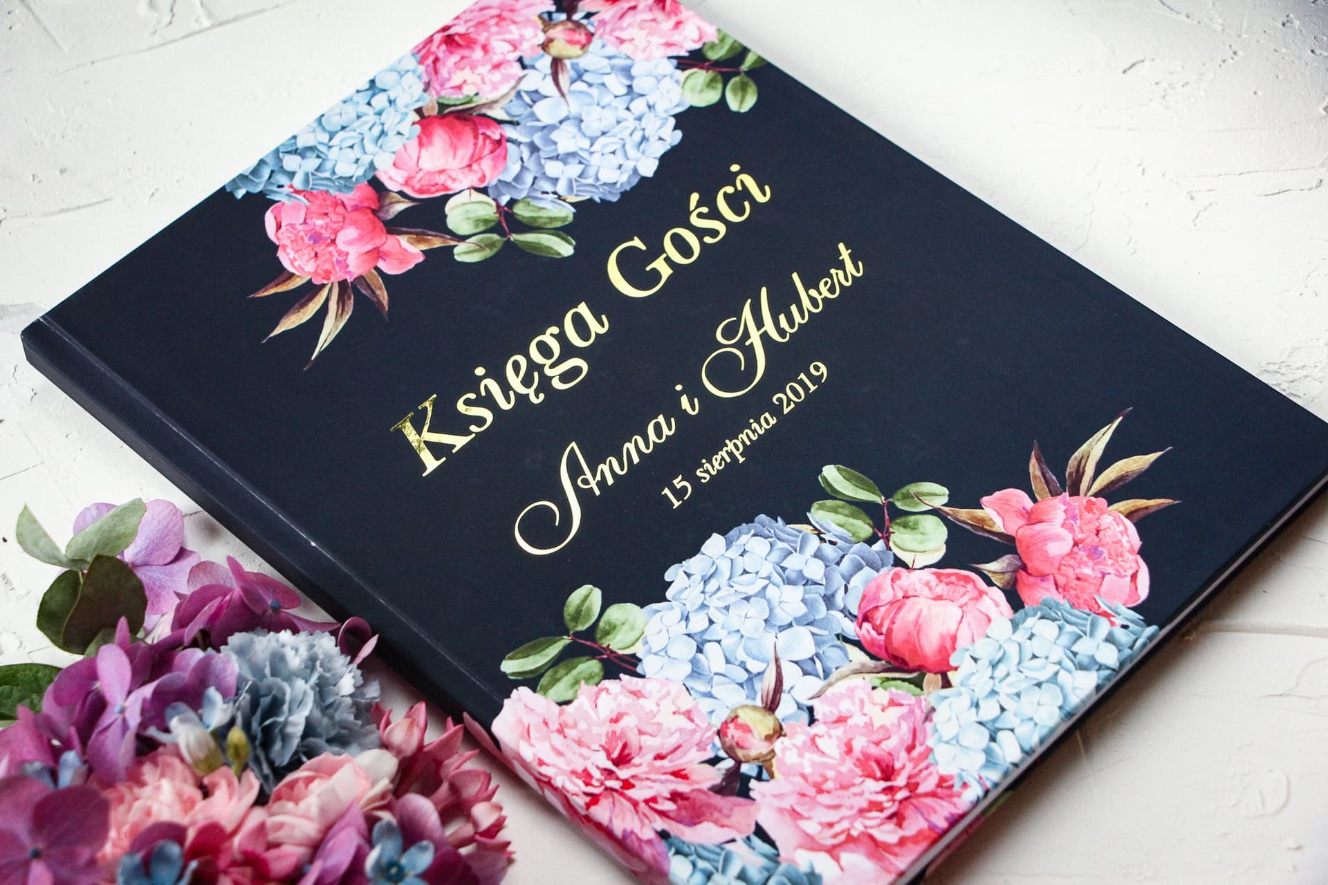 Personalisiertes Gästebuch Goldprägung, Blau-Rosa Blumen | Hochzeitsandenken | Szafirowe Nr. 5