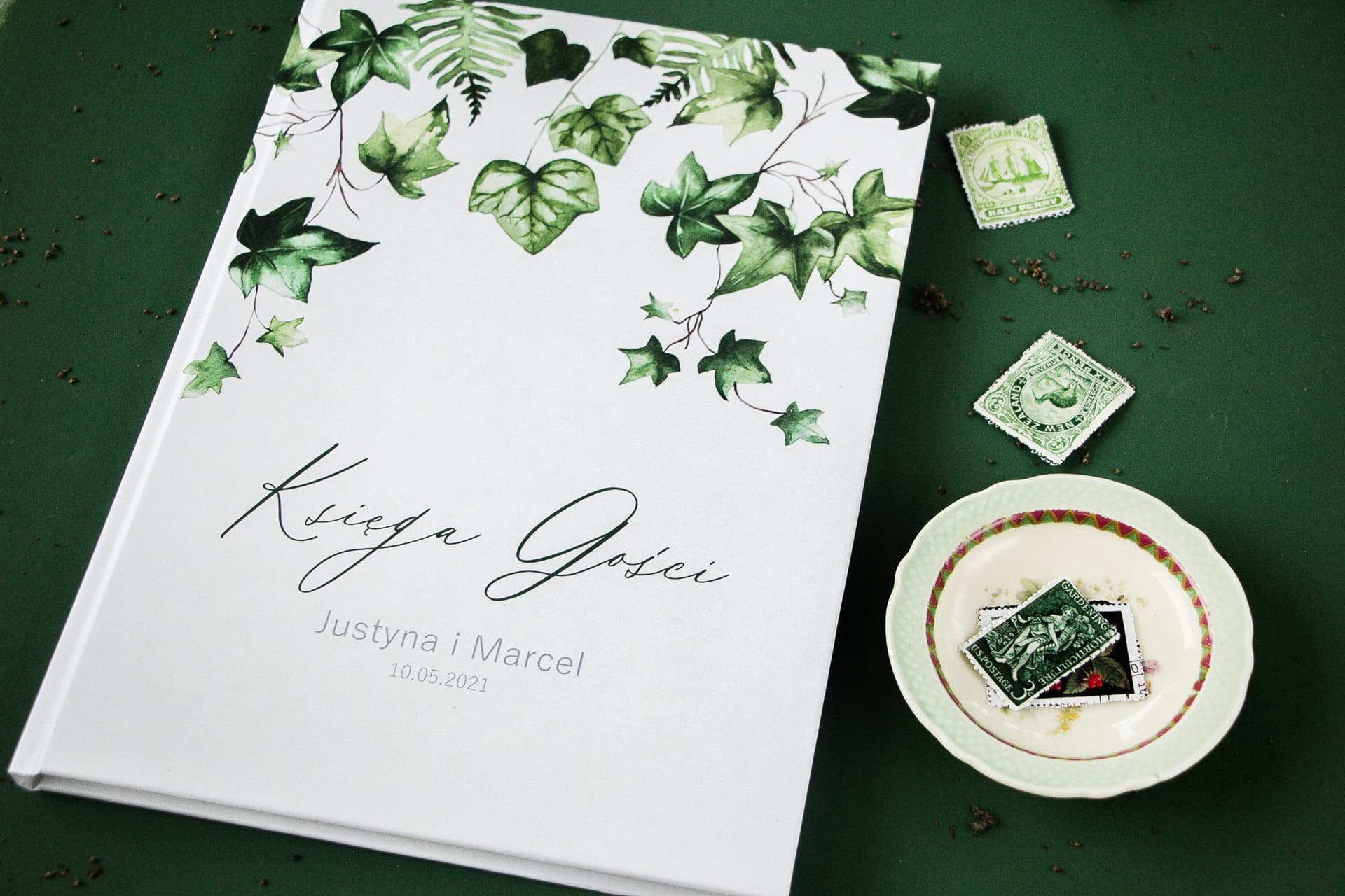 Das Efeu-Motiv aus der Kollektion Soft Nr. 2 hat Sie so verzaubert, dass Sie es auf anderen Elementen Ihrer Papeterie wiederfinden möchten? Das verstehen wir vollkommen! Bei Amelia-Wedding.pl bieten wir die Möglichkeit, eine komplette, stimmige grafische Gestaltung für Ihre Hochzeit zu kreieren. Passend zu Ihrem Traum-Gästebuch können wir passende Hochzeitseinladungen, Tischkarten, Flaschenanhänger, Gastgeschenke und sogar ein Menü entwerfen und fertigen. Eine solche stilistische Konsequenz wird Ihre Liebsten begeistern und die gesamte Zeremonie äußerst elegant und professionell wirken lassen. Lassen Sie sich von den neuesten Ideen inspirieren und lesen Sie mehr über die Hochzeitstrends für 2025.