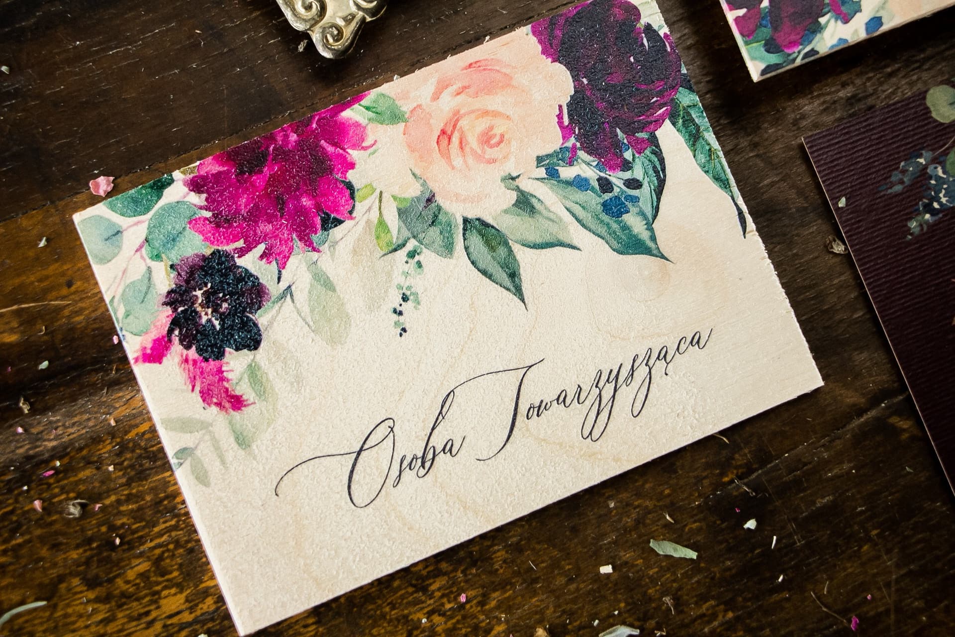 Die Organisation einer Hochzeit im rustikalen oder Boho-Stil erfordert Liebe zum Detail, um die Nähe zur Natur zu betonen. Unsere burgunderroten Tischkarten auf Holz sind die Quintessenz dieses Trends. Die natürliche Textur des Holzes, kombiniert mit dem floralen Waldmotiv, bildet eine harmonische Einheit mit anderen Dekoelementen wie Leinentischdecken, Holzscheiben, Feldblumen oder Kerzen. Wenn Sie sich für die Tischkarten Topaz Nr. 3 entscheiden, setzen Sie auf Authentizität und eine herzliche Atmosphäre, in der sich Ihre Gäste wohl und besonders fühlen werden. Interessanterweise fragen sich viele Paare, ob man auch Tischkarten für das Brautpaar erstellt – es ist ein schöner Brauch, um die neuen Ehrenplätze am Tisch hervorzuheben.