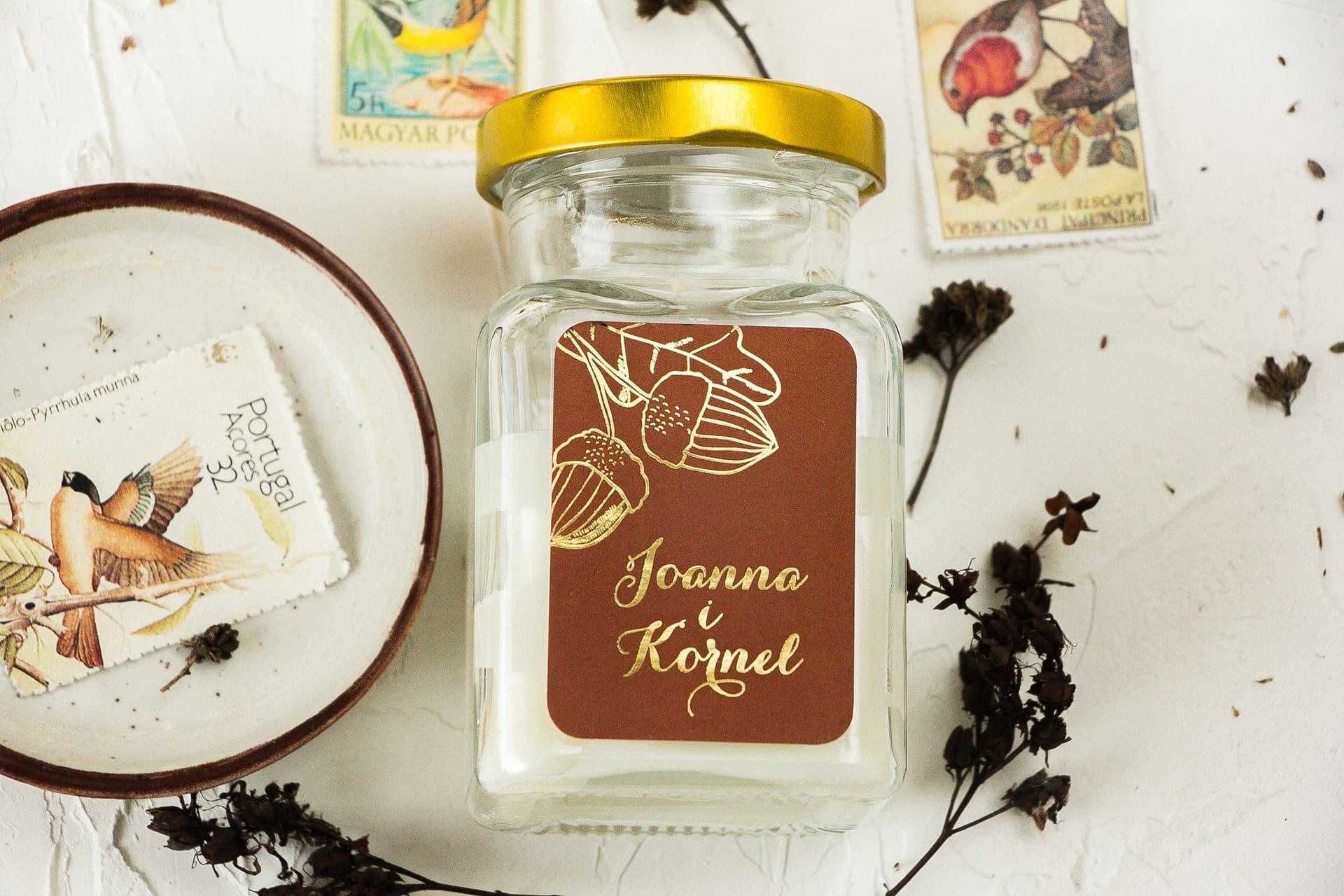Denken Sie daran, dass die Kerzen aus der Kollektion Pattern Nr. 1 erst der Anfang sind. Um einen völlig harmonischen visuellen Rahmen für Ihre Feierlichkeit zu schaffen, bieten wir die Möglichkeit, eine ganze Palette an Hochzeitszubehör mit demselben eleganten Eichel-Motiv zu bestellen. Stellen Sie sich Hochzeitseinladungen, Tischkarten, Flaschenanhänger und sogar ein Gästebuch vor – alles in einem einheitlichen gold-herbstlichen Stil. Diese Liebe zum Detail zeigt Ihren Gästen, wie viel Herzblut Sie in die Vorbereitungen gesteckt haben, und hilft dabei, eine wahrhaft luxuriöse Atmosphäre zu schaffen, selbst bei einem begrenzten Budget, worüber Sie mehr in unserem Blog lesen können: Wie man eine luxuriöse Atmosphäre bei einer Hochzeit mit kleinem Budget schafft.