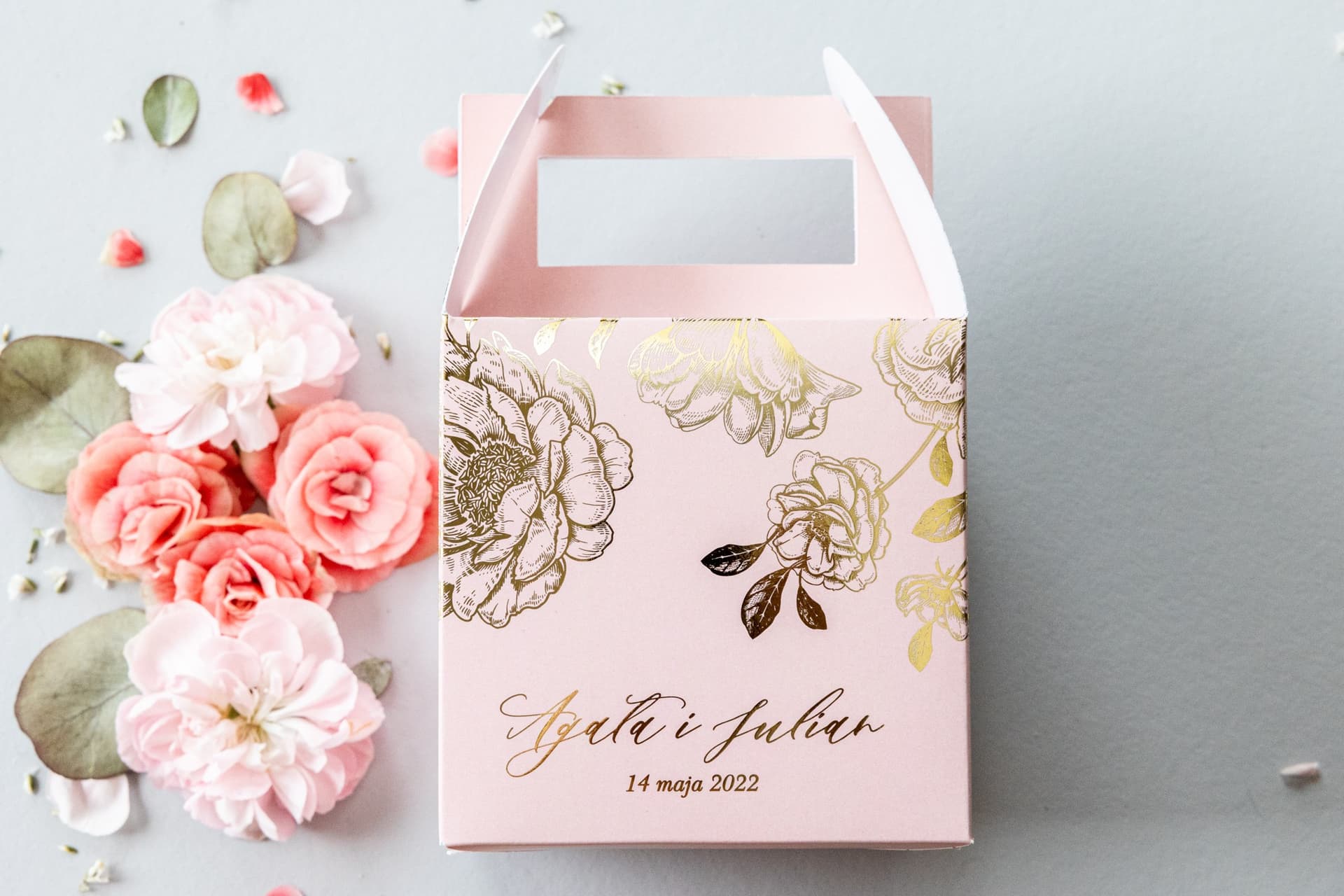 Die Boxen der Kollektion Onyks nr 1 sind nicht nur ein Einzelprodukt. Sie sind Teil eines großen Ganzen. In unserem Sortiment finden Sie auch Hochzeitseinladungen, Tischkarten, Flaschenanhänger und weitere Accessoires mit demselben vergoldeten Pfingstrosen-Motiv. Die Erstellung einer einheitlichen Hochzeitspapeterie war noch nie so einfach und ermöglicht einen äußerst eleganten, harmonischen Effekt, der Ihre Gäste begeistern wird. Die Boxen werden in verklebter Form geliefert, bereit für einen schnellen und einfachen Aufbau – Sie müssen sich im Trubel der Hochzeitsvorbereitungen nicht um kompliziertes Falten kümmern. Dies ist eine praktische Lösung, um sich auf schöne Weise bei Ihren Gästen zu bedanken. Wenn Sie sich fragen, was man Gästen sonst noch schenken kann, schauen Sie in unseren Ratgeber über süße Gastgeschenke zur Hochzeit.