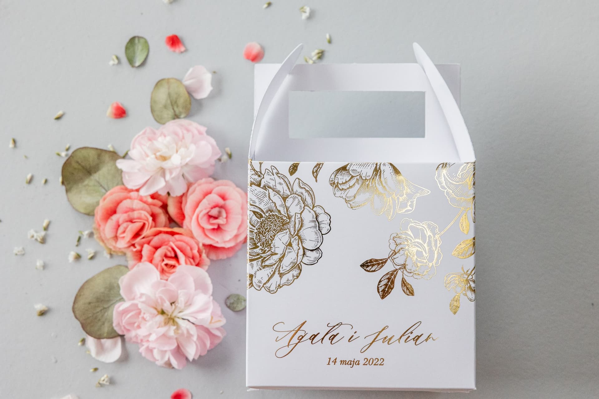 Elegante Kuchenboxen zur Hochzeit aus der Kollektion Onyks Nr. 3 sind der Inbegriff von Luxus, ideal um Ihren Gästen Danke zu sagen. Die subtile, vergoldete Grafik mit Blumenmotiv auf hochwertigem weißem Papier hinterlässt einen bleibenden Eindruck. Wir bieten Ihnen die vollständige Personalisierung des Designs völlig kostenlos an, damit es perfekt zum Stil Ihrer Feier passt. Dies ist nicht nur eine Verpackung, sondern eine schöne Erinnerung und ein Ausdruck Ihrer Dankbarkeit. Bestellen Sie und gestalten Sie mit uns einzigartige Dankeschön-Geschenke!