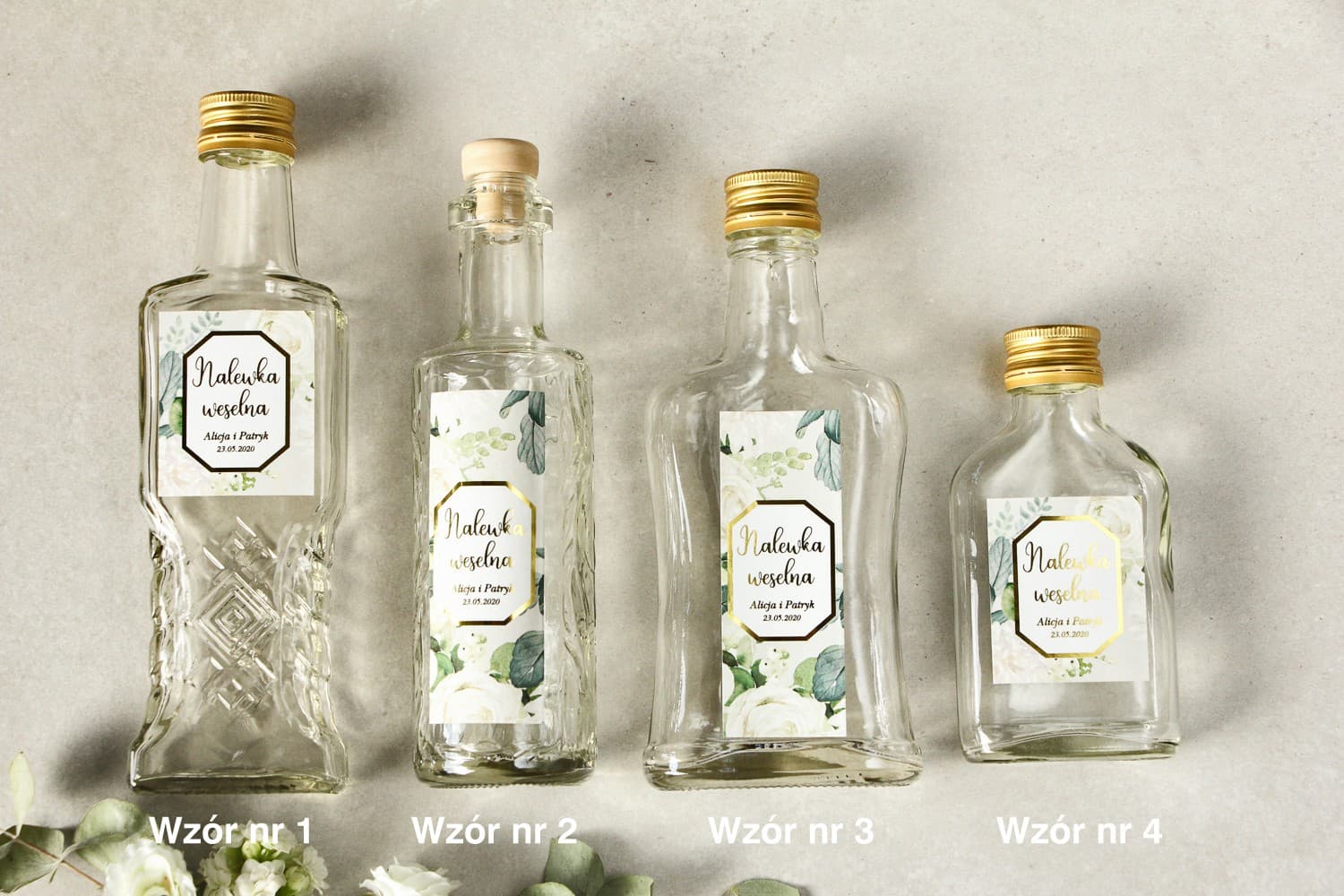 Die Kollektion Lotus Nr. 4 ist die Quintessenz des Glamour-Stils in seiner schönsten Form. Diese exklusiven Fläschchen als Gastgeschenke wurden für Paare entworfen, die Luxus und Liebe zum Detail schätzen. Gefertigt aus hochwertigem, dickem Glas, eignen sie sich ideal für die Aufbewahrung hausgemachter Spezialitäten – vom traditionellen Likör nach Großmutters Rezept bis hin zum edlen Hochzeitsbrand. Was dieses Modell auszeichnet, ist das wunderschöne, personalisierte Etikett. Ein dezentes Muster aus weißen Rosen und Pfingstrosen auf einem Hintergrund aus grünen Zweigen schafft eine romantische Komposition. Veredelt wird das Ganze durch Goldprägungen, die im Licht herrlich schimmern und dem Präsent einen exklusiven Charakter verleihen. Dies ist kein gewöhnlicher Aufkleber – es ist ein kleines Kunstwerk, das jeden Hochzeitstisch schmückt.