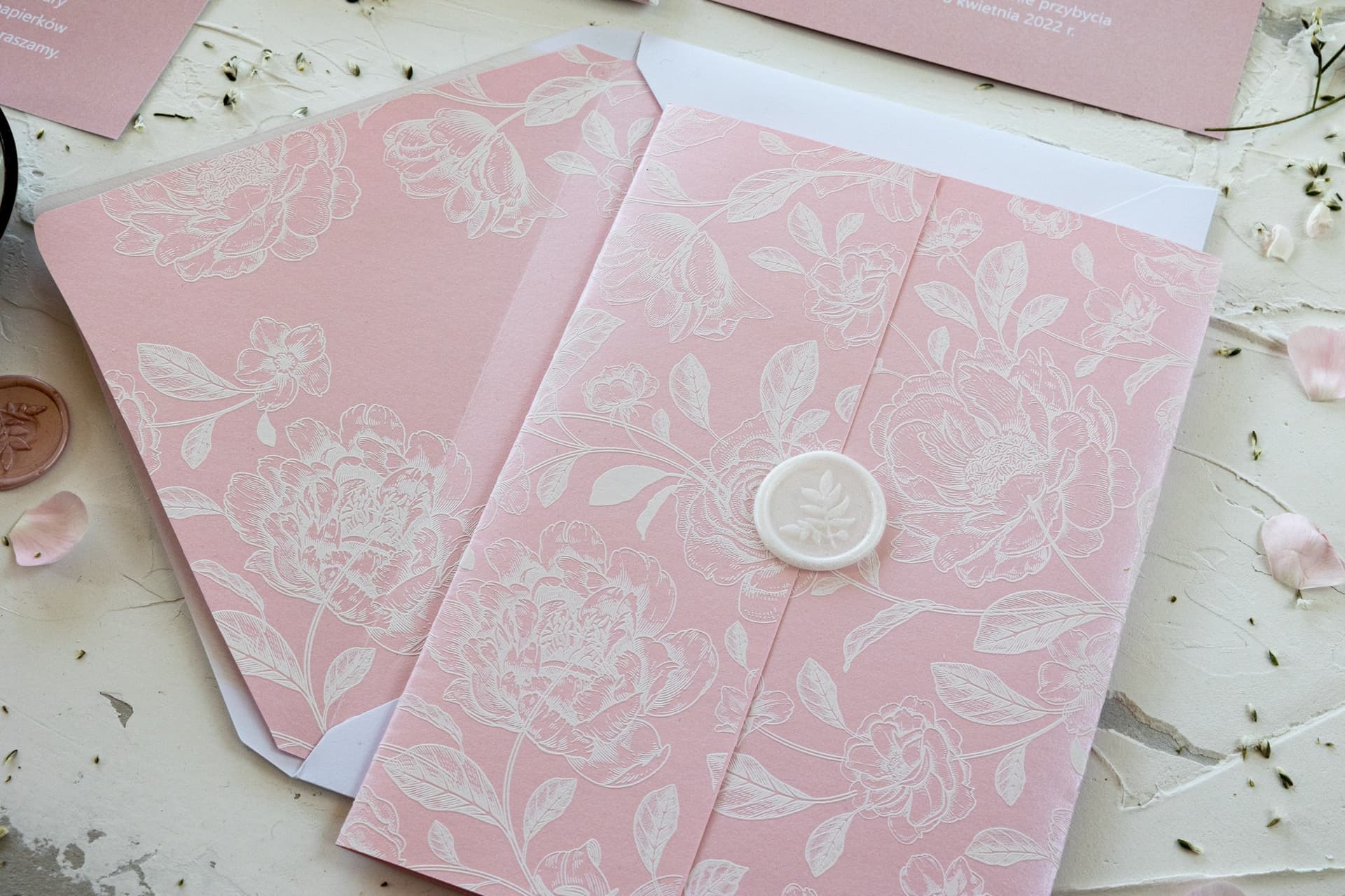 Was die Kollektion Nefryt auszeichnet, ist die traumhafte Hülle aus Transparentpapier. Sie verleiht der Einladungskarte Leichtigkeit, Geheimnisvolles und erzeugt einen wunderschönen, mehrschichtigen Effekt. Das darauf gedruckte Motiv weißer Pfingstrosen ist nicht nur ein schönes grafisches Detail, sondern auch ein Symbol für Glück, Wohlstand und aufblühende Liebe. Dank des Musters können Sie die Präzision des Drucks prüfen und sehen, wie die Hülle den Inhalt der Einladung auf der Hauptkarte wunderschön zur Geltung bringt. Pfingstrosen gehören zu den modischsten Blumen, was auch die Trends in der Hochzeitsfloristik bestätigen.