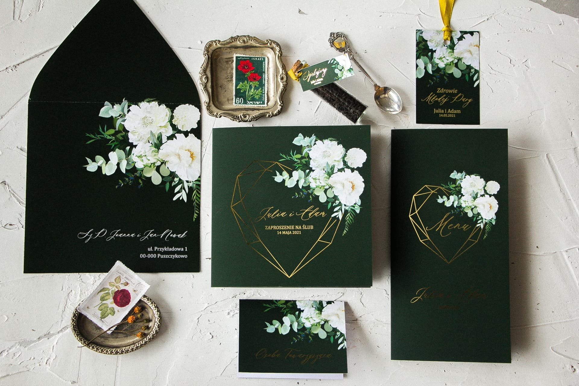 Das Set besteht aus: einer Einladungskarte aus der Kollektion Szafirowe, einer Tischkarte, einem Flaschenanhänger, einer Menükarte, einem dekorativen Teefläschchen, einem zusätzlichen Beileger (105x148 mm) sowie einem Rabattgutschein im Wert von 10 zł für Ihre Hauptbestellung.