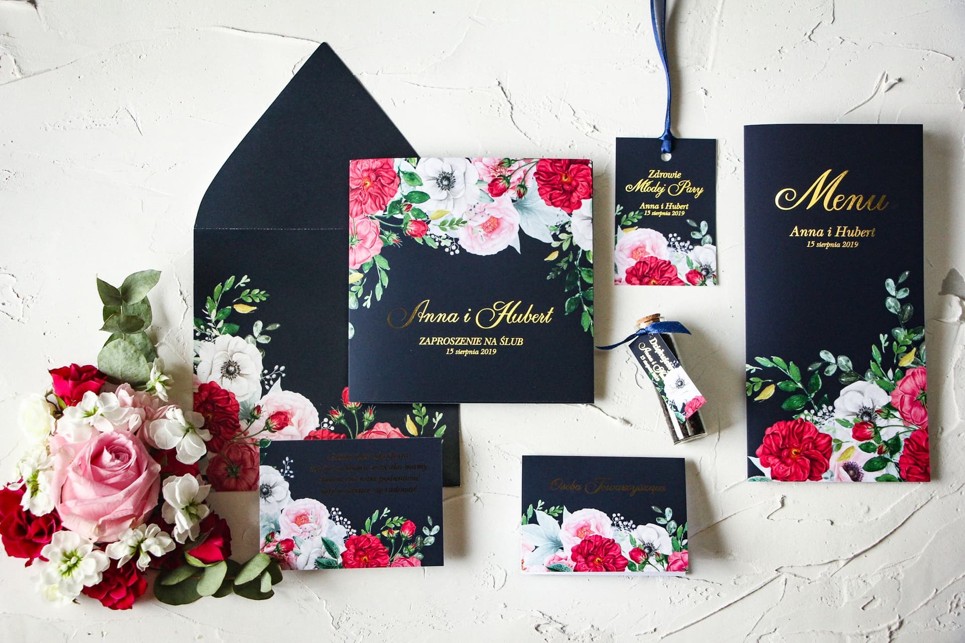 Die Kollektion Szafirowe nr 4 ist die ideale Wahl für Paare, die moderne Eleganz mit einem Hauch von Glamour schätzen. Die Kombination aus tiefem Dunkelblau, das Vertrauen und Harmonie symbolisiert, und edlem Gold, das mit Luxus und Feierlichkeit assoziiert wird, bildet ein perfektes Duo. Diese Papeterie passt ideal zu den neuesten Hochzeitstrends und bleibt gleichzeitig zeitlos. Indem Sie eine ganze Produktlinie wählen – von Einladungen über Tischkarten, Menükarten und Tischnummern bis hin zu Gastgeschenken – schaffen Sie einen unglaublich stimmigen und durchdachten visuellen Rahmen für Ihren großen Tag. Es sind genau diese Details, die dafür sorgen, dass die Feier als ein bis ins kleinste Detail perfektioniertes Ereignis in Erinnerung bleibt.