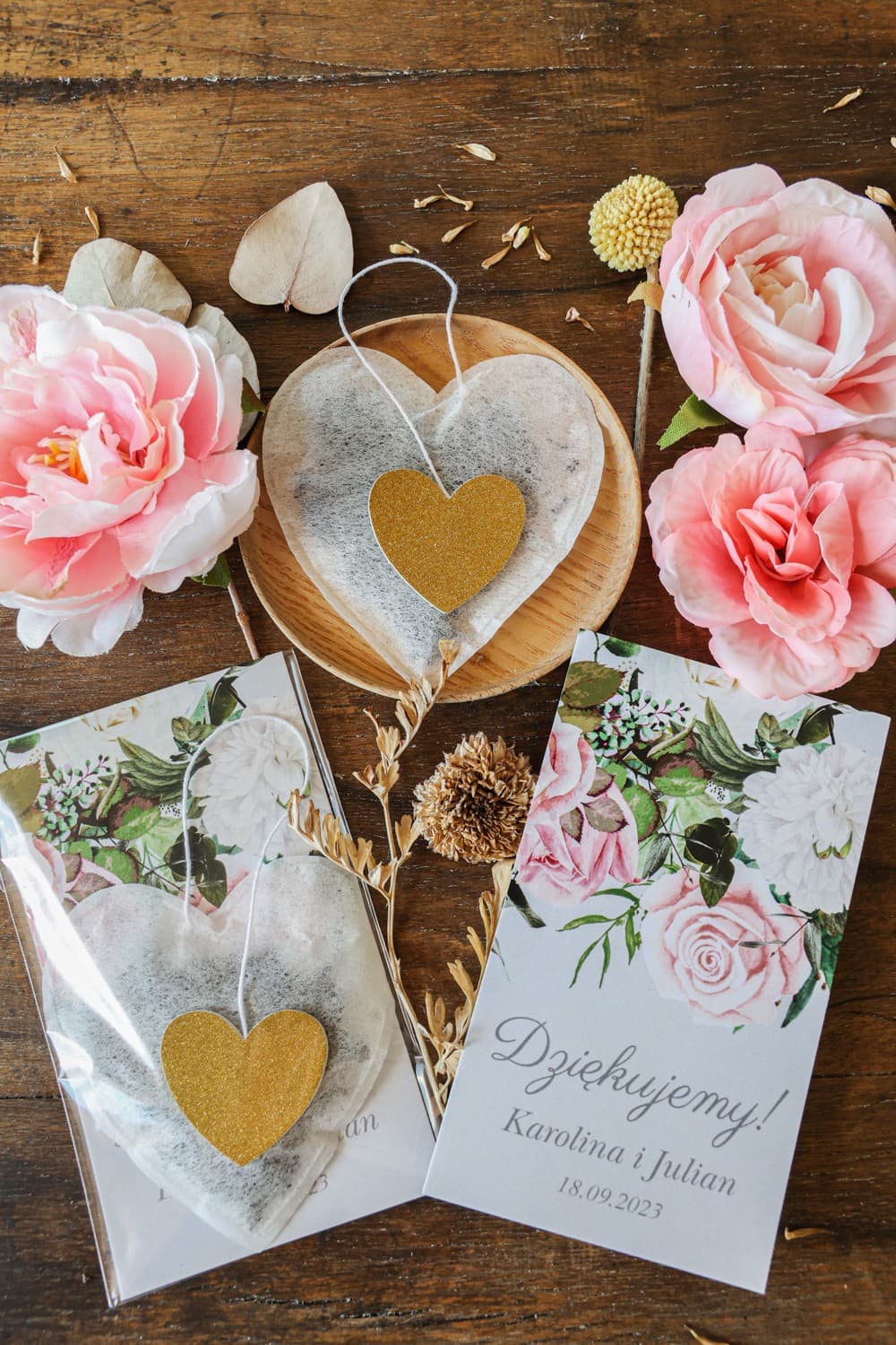 Originelle Gastgeschenke fĂŒr Ihre HochzeitsgĂ€ste in Form eines aromatischen Tees in Herzform sind eine Geste, die lange in Erinnerung bleibt. Unsere Tees aus der Kollektion Eteryczne, verziert mit einer dezenten Grafik aus pastellfarbenen Rosen, stellen ein elegantes und persönliches Geschenk dar. Jedes SĂ€ckchen birgt eine sorgfĂ€ltig ausgewĂ€hlte Geschmackskomposition, und dank der vollstĂ€ndigen Personalisierung der Etiketten können Sie Ihren eigenen Text und Namen hinzufĂŒgen, um ein einzigartiges Andenken zu schaffen. Schenken Sie Ihren Liebsten mehr als nur ein Geschenk â schenken Sie einen Moment der Entspannung und eine warme Erinnerung an Ihren besonderen Tag.