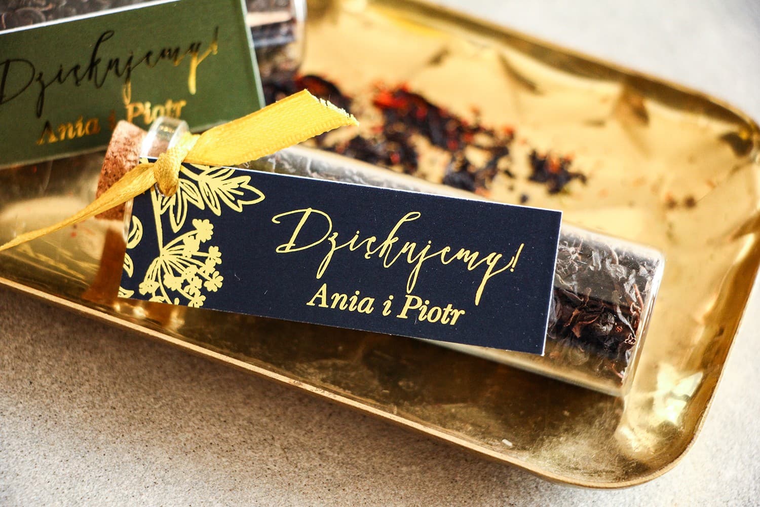 Suchen Sie elegante Gastgeschenke, die lange in Erinnerung bleiben? Unsere FlÀschchen mit aromatischem Blatttee sind die ideale Wahl. Jedes Glas ist mit einem personalisierten AnhÀnger im Glamour-Stil verziert, der tiefes Dunkelblau mit goldenen Details kombiniert. Dies ist nicht nur ein Geschenk, sondern auch eine wunderschöne Tischdekoration. Schenken Sie Ihren Liebsten etwas Besonderes! Nutzen Sie das kostenlose Design und gestalten Sie ein einzigartiges Dankeschön mit der Kollektion Szafir.