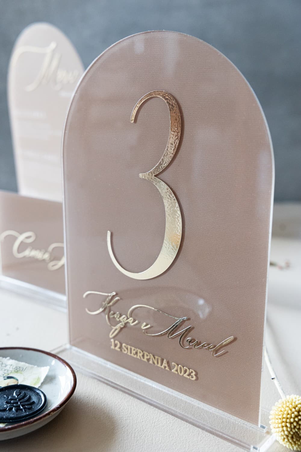 Die Organisation einer Hochzeitsfeier ist die Kunst, sich um Details zu kümmern. Genau diese Details schaffen eine unvergessliche Atmosphäre und geben Ihren Gästen das Gefühl, etwas Besonderes zu sein. Eines der Schlüsselelemente, das Funktionalität mit raffinierter Ästhetik verbindet, ist die Tischnummerierung. Wir präsentieren Ihnen die beigen Tischnummern aus Plexiglas aus der Kollektion Dalia Nr. 3 – ein Produkt, das zu einer dezenten und zugleich ausdrucksstarken Dekoration Ihres Saals wird. Gefertigt aus hochwertigem beigem Plexiglas und veredelt mit goldglänzenden Ziffern, sind diese Tischnummern ein Synonym für moderne Eleganz und den Glamour-Stil. Vergessen Sie gewöhnliche Papierkärtchen – setzen Sie auf eine Lösung, die den Rang Ihrer Feierlichkeit unterstreicht und Ihre Gäste auf den ersten Blick begeistern wird.