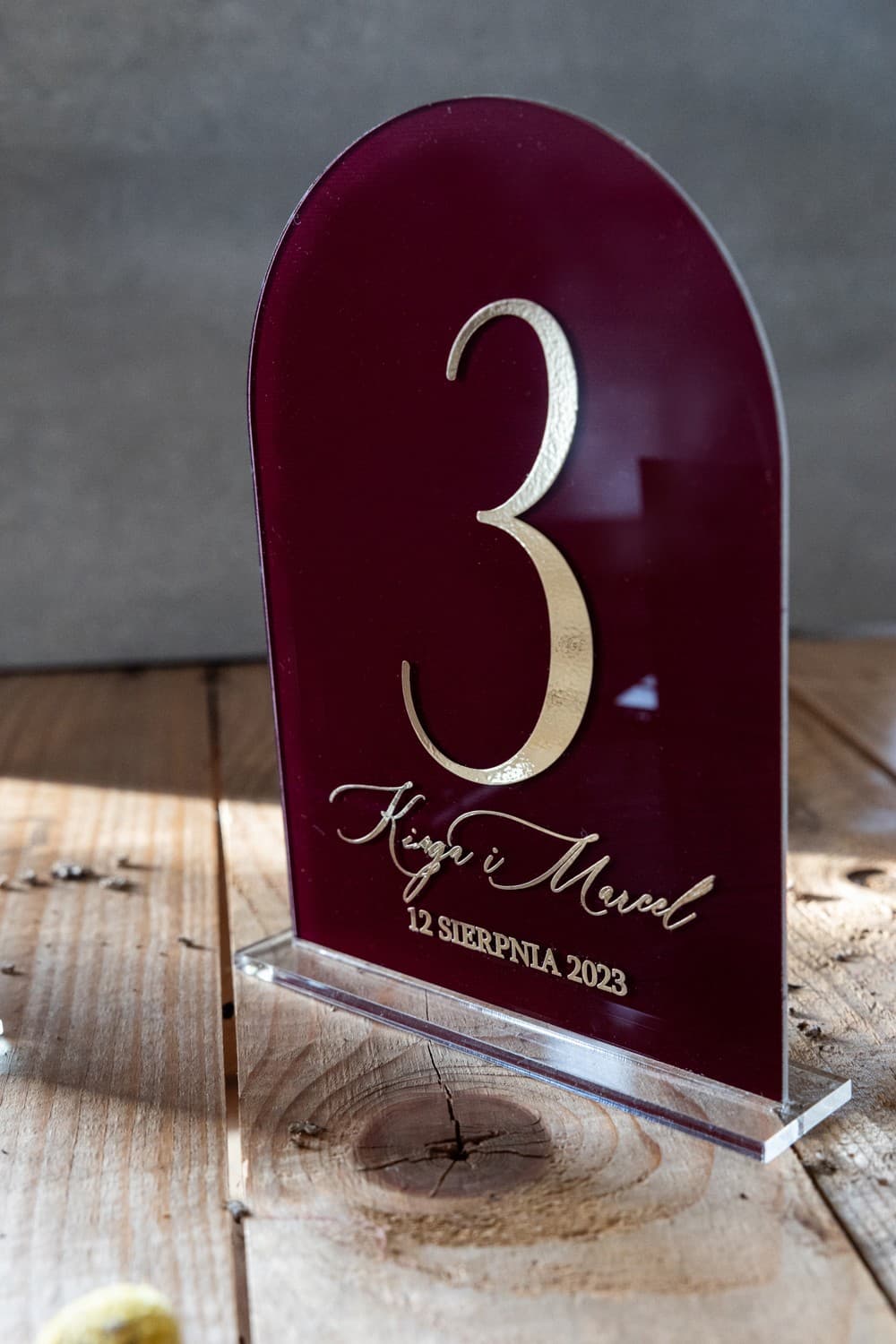Die Organisation einer Hochzeitsfeier ist die Kunst, sich um kleinste Details zu kümmern, die zusammen ein unvergessliches Ganzes ergeben. Eines der Schlüsselelemente, das den Komfort Ihrer Gäste und die Ästhetik des Saals beeinflusst, ist eine klare und stilvolle Tischnummerierung. Wir präsentieren Ihnen exklusive Tischnummern aus der Kollektion Dalia Nr. 6, die die Antwort auf die Bedürfnisse der anspruchsvollsten Brautpaare sind, die von einer Traumhochzeit im Glamour-Stil träumen. Die Kombination aus tiefem, weinrotem Bordeaux und edlem Gold ist ein ideales Duo, das Liebe, Luxus und Leidenschaft symbolisiert. Unsere Karten aus hochwertigem Plexiglas erfüllen nicht nur perfekt ihre praktische Funktion, sondern werden zu einer geschmackvollen Dekoration, die die Blicke auf sich zieht und den feierlichen Charakter des Tages unterstreicht.