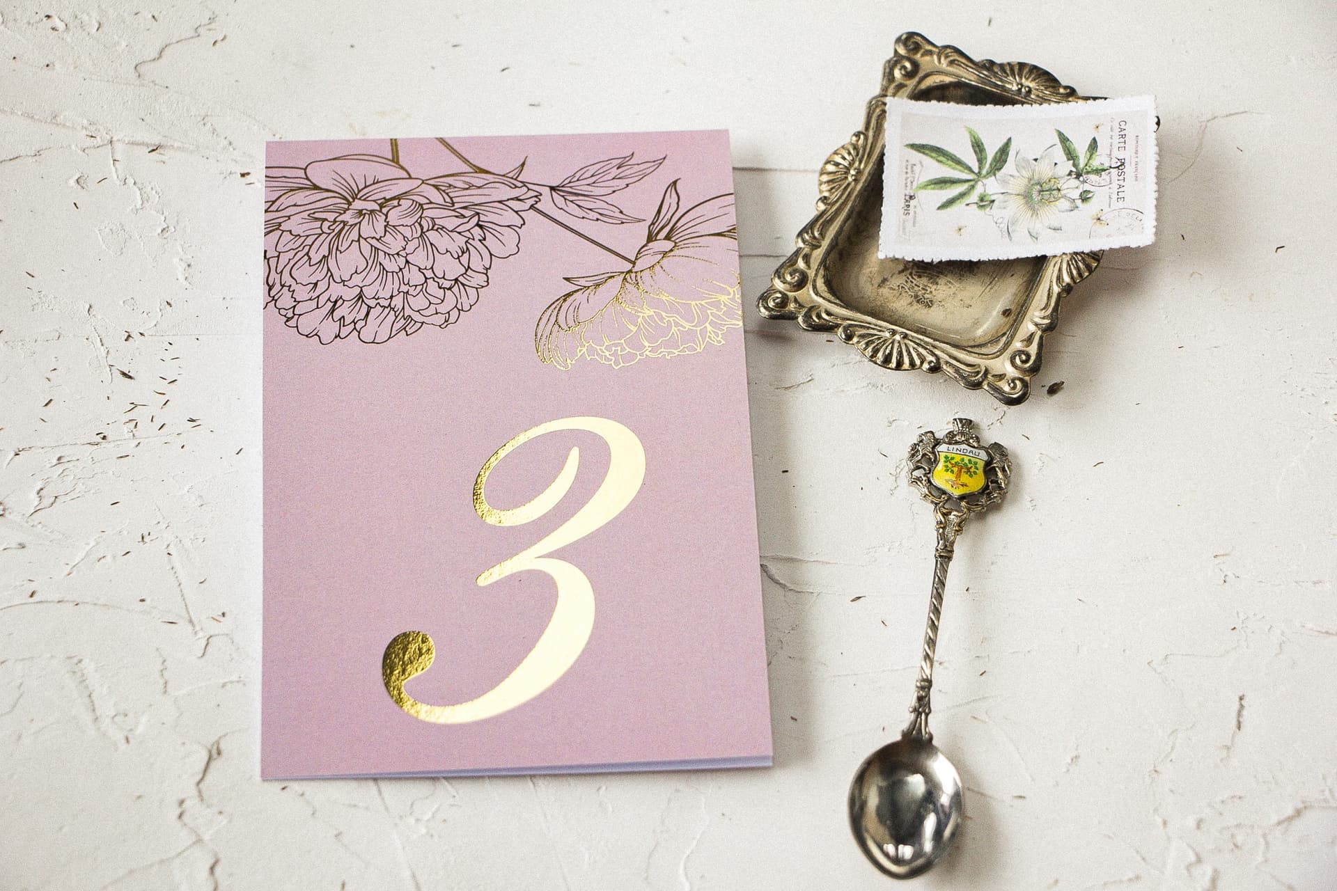 Vergoldete Tischnummern mit Pfingstrosen | Elegante Tischnummerierung pastellfarbene Blumen | Pattern Nr. 4