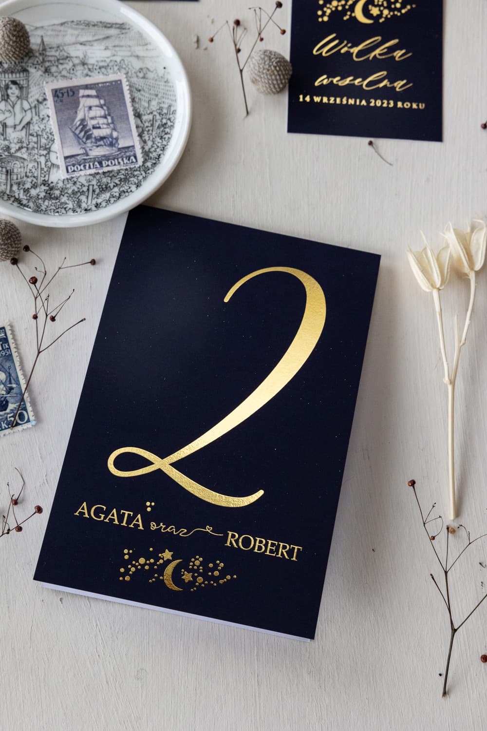 Das Modell Simple Nr. 1 zeichnet sich durch die Kombination von Dunkelblau und Gold aus. Wir bei Amelia-Wedding.pl sind jedoch auf Personalisierung spezialisiert! Wenn Sie sich eine andere Farbgebung wünschen (z. B. Silber statt Gold, Tannengrün statt Dunkelblau), kontaktieren Sie uns bitte. Gerne erstellen wir für Sie ein individuelles Design und Angebot, damit die Papeterie perfekt zu Ihrer Vision passt.