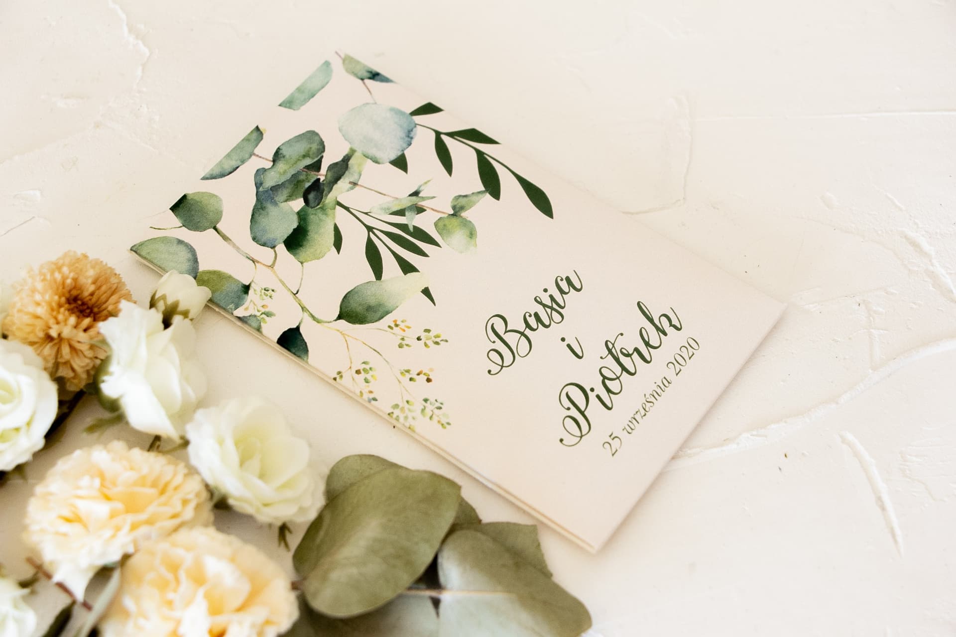 Gefaltetes Hochzeitsmenü mit Eukalyptus | Elegante Menükarte für den Hochzeitstisch Grün | Korani Nr. 3