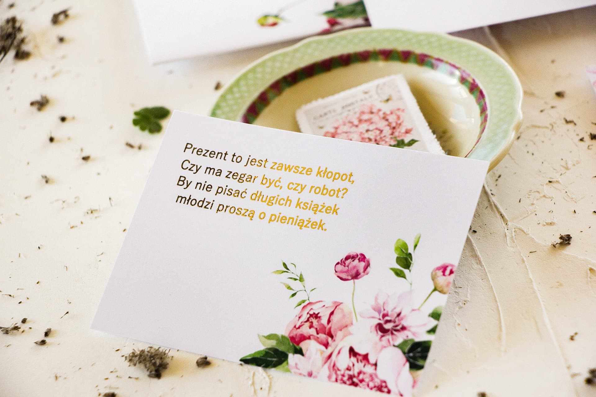 Die Hauptkarte der Hochzeitseinladung sollte sich auf das Wesentliche konzentrieren: wer, wen, wann und wohin einlädt. Alle zusätzlichen Informationen, wie Bitten bezüglich der Geschenke oder organisatorische Details, können die Komposition stören. Ein separater, aber grafisch kohärenter Beileger ermöglicht eine elegante Vermittlung dieser Inhalte, ohne Kompromisse bei der Ästhetik einzugehen. Die Kollektion Serenity passt dank der Kombination aus pastelligen Blumen und goldenen Details ideal zum Glamour-Stil, zur Romantik oder zum modernen Design.
