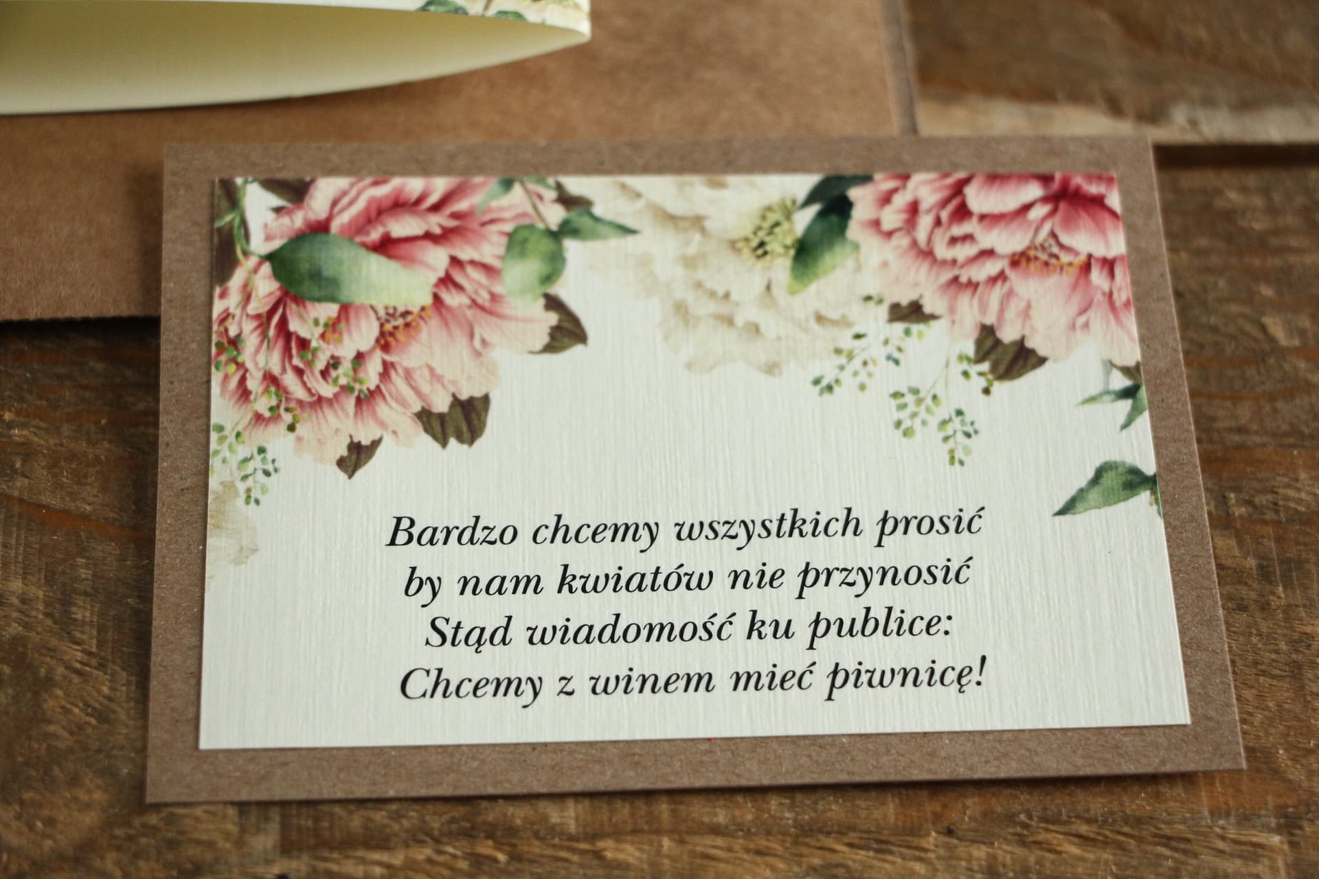 Dwuwarstwowy bilecik kraft z piwoniami – detal, który robi różnicę