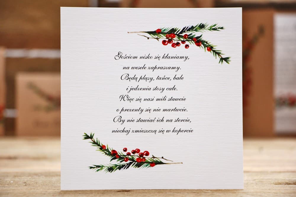 Dodajcie nutę leśnego uroku do Waszych zaproszeń dzięki tej wyjątkowej wkładce informacyjnej. Klimatyczny motyw gałązek świerku i owoców jarzębiny, nadrukowany na eleganckim papierze z fakturą lnu, idealnie wpisuje się w stylistykę jesiennych i zimowych uroczystości. To doskonały sposób, by w subtelny i stylowy sposób przekazać gościom dodatkowe informacje, takie jak prośby dotyczące prezentów, szczegóły dojazdu czy potwierdzenie przybycia. Zaprojektujcie Wasz idealny bilecik w naszym kreatorze online – projekt i nielimitowane poprawki otrzymacie całkowicie za darmo!