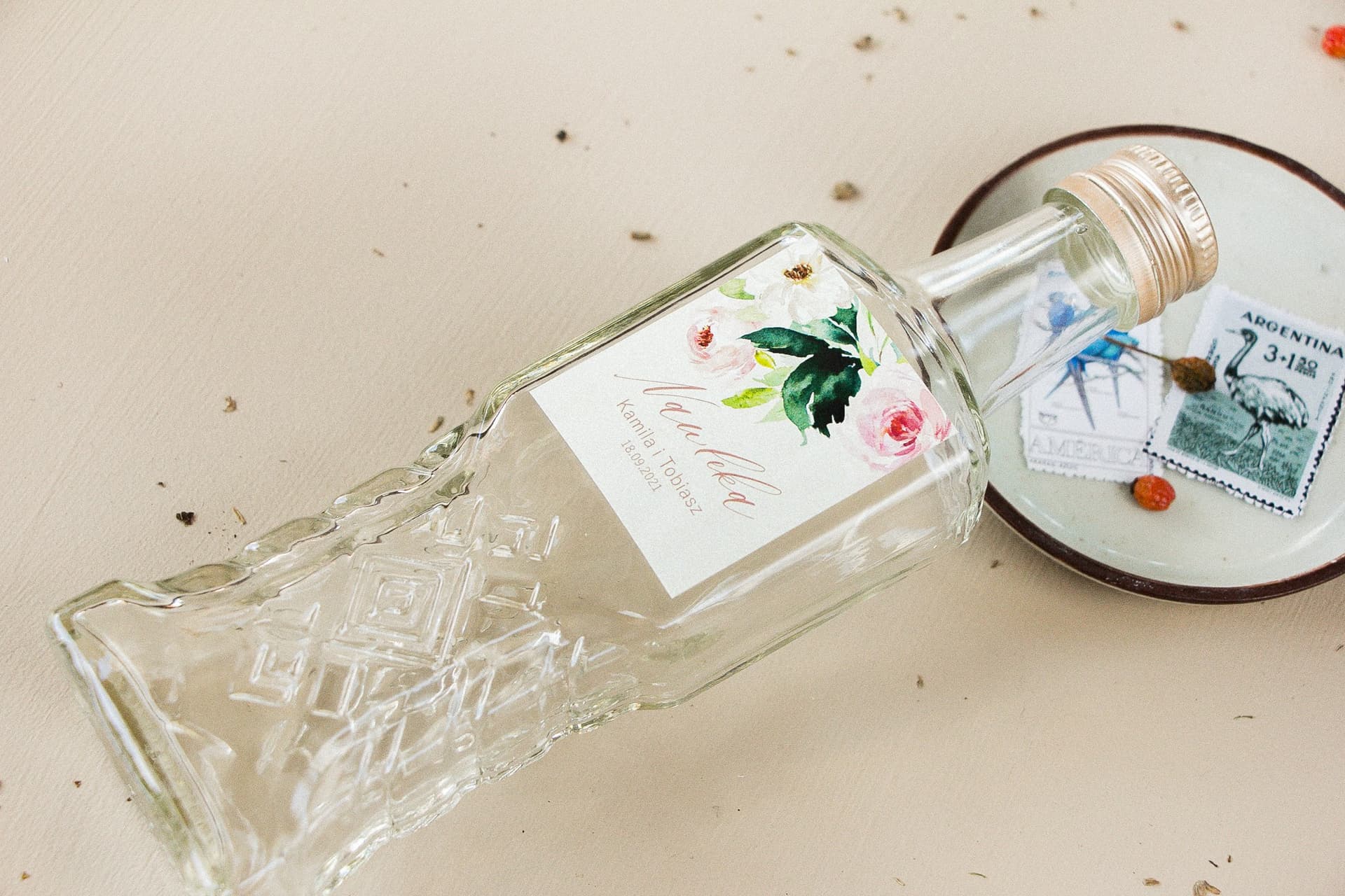 Eleganckie zawieszki na wódkę z piwoniami | Personalizowane przywieszki na alkohol weselny | Opal nr 8