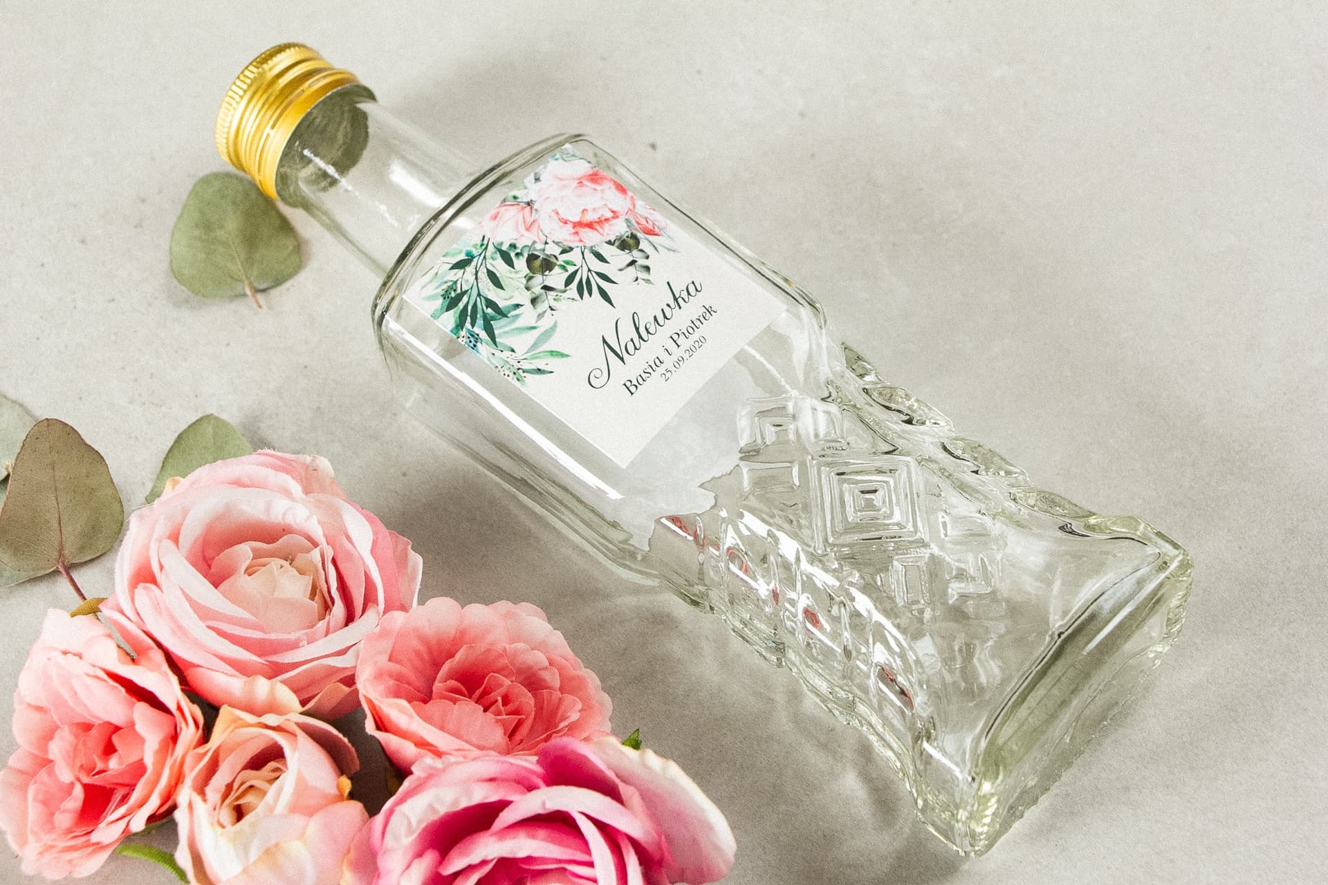 Buteleczki na nalewki jako podziękowania dla gości z etykietą w różowe piwonie Korani nr 7