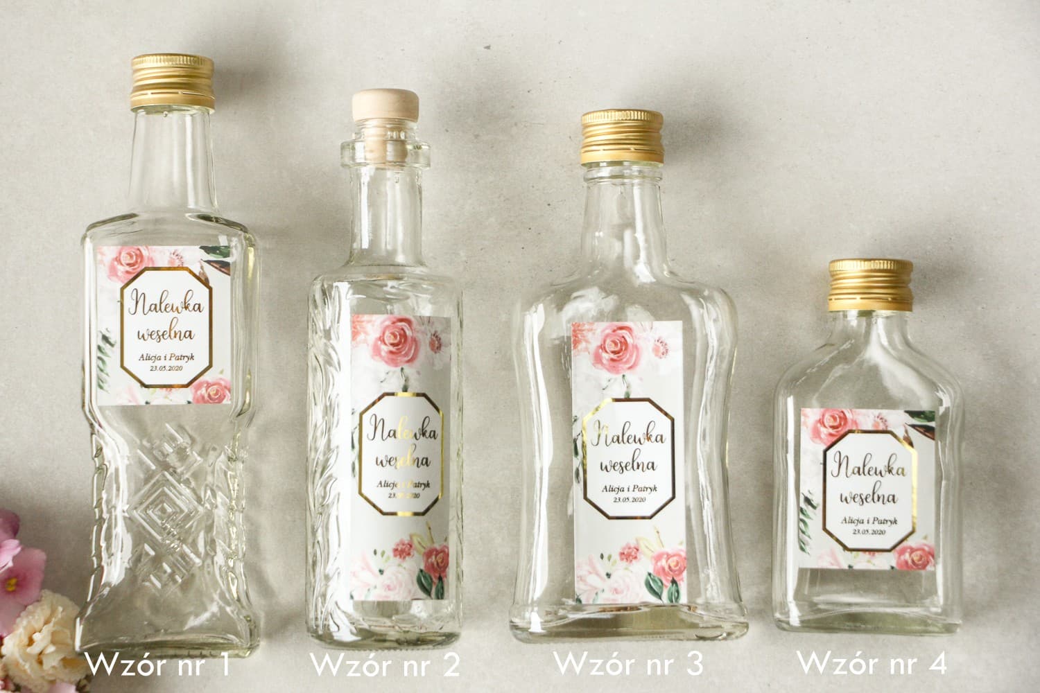 Buteleczki na Nalewki Weselne Złocone Etykiety Piwonie | Personalizowane Podziękowania dla Gości | Lotus nr 2