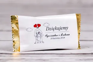 Szukacie zabawnych i oryginalnych podziękowań dla gości? Nasze personalizowane czekoladki z wyśmienitym nadzieniem adwokatowym to strzał w dziesiątkę! Urocza grafika z Parą Młodą niesioną przez czerwone baloniki wywoła uśmiech na twarzach Waszych bliskich. Każda czekoladka to słodki gest wdzięczności, który Wasi goście zapamiętają na długo. Zamówcie już dziś i skorzystajcie z opcji darmowego projektu i pełnej personalizacji, aby stworzyć upominek idealnie pasujący do Waszego wesela!