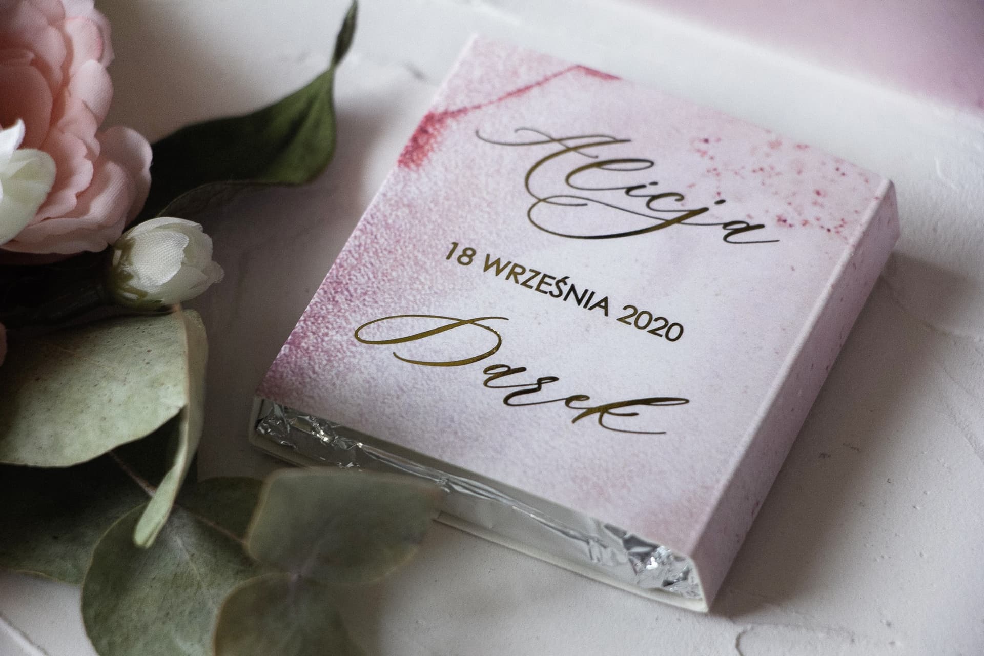 Co sprawia, że nasze czekoladki są tak wyjątkowe? To przede wszystkim ich niepowtarzalny design. Zainspirowani luksusem i ponadczasową elegancją, stworzyliśmy owijki z subtelnym wzorem pastelowego, różowego marmuru. Ten modny motyw, kojarzony z wyrafinowaniem, stanowi idealne tło dla personalizowanych napisów. Dodatkowym elementem, który przyciąga wzrok i nadaje całości ekskluzywnego charakteru, jest błyszczące, złote wykończenie. Złocone napisy, takie jak Wasze imiona, data ślubu czy słowo "Dziękujemy", pięknie kontrastują z marmurkowym tłem, tworząc małe dzieła sztuki. To idealne rozwiązanie, jeśli chcecie, aby Wasze eleganckie podziękowania dla gości harmonizowały z innymi złotymi elementami dekoracji sali weselnej.