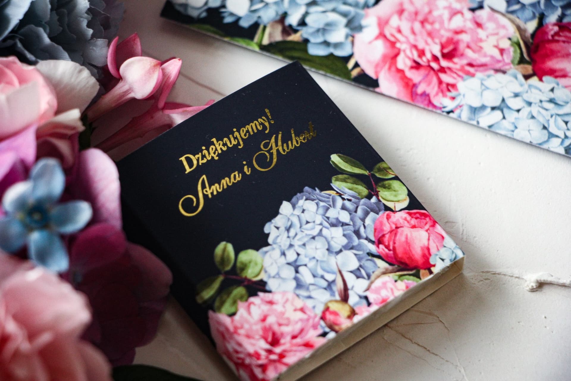 Szukasz wyjątkowych podziękowań dla gości? Nasze personalizowane czekoladki ślubne to idealny wybór! Każda pyszna, mleczna czekoladka (34g) jest otulona elegancką owijką z pięknym motywem różowych piwonii i niebieskich hortensji. Złote, personalizowane napisy dodają całości luksusowego charakteru, tworząc niezapomniany, słodki upominek. To doskonały sposób, by wyrazić wdzięczność i zachwycić bliskich. Skorzystaj z darmowego projektu i stwórz niepowtarzalne podziękowania, które dopełnią aranżację Twojego przyjęcia weselnego.