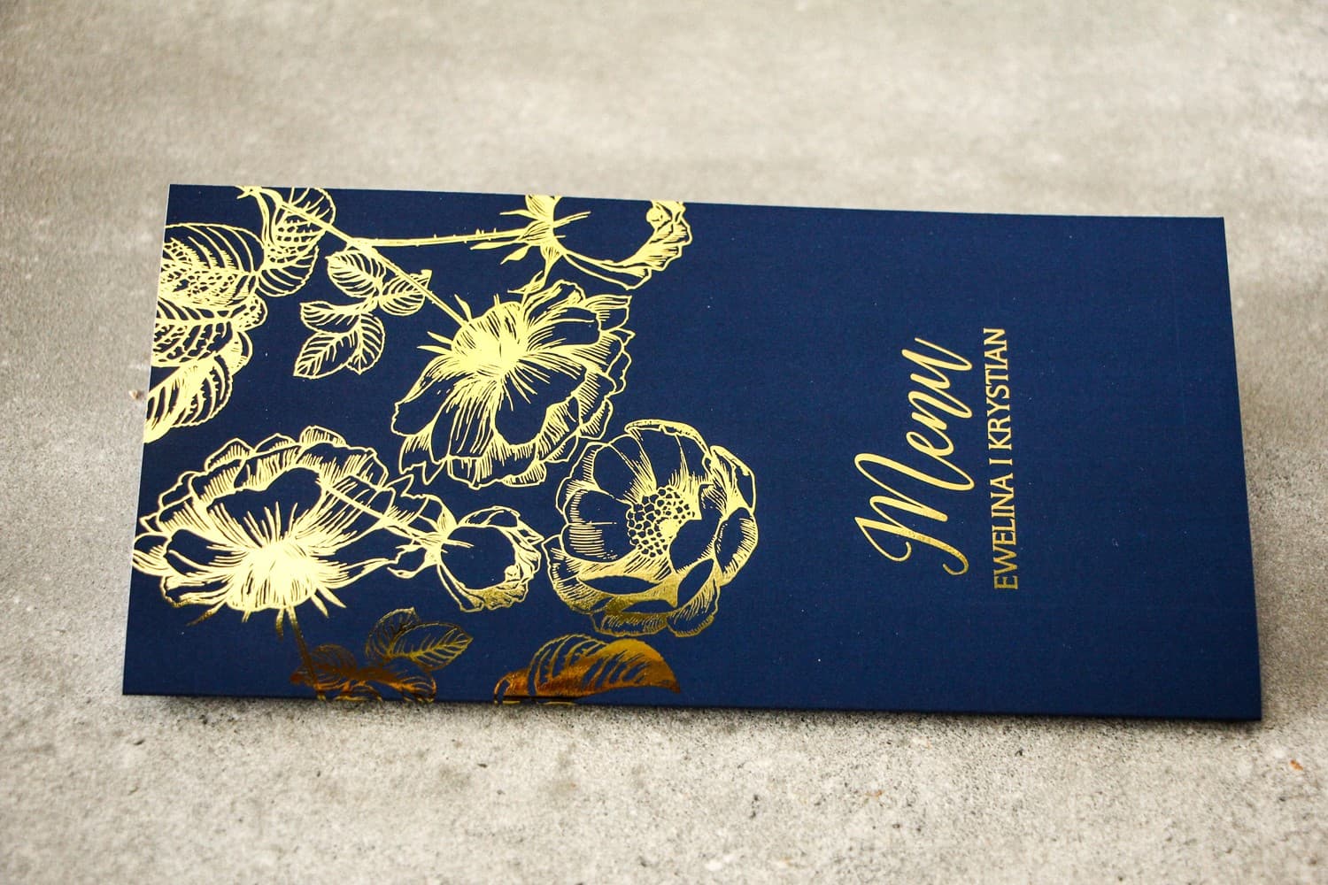 Skorzystaj z naszego kreatora online lub wsparcia grafika i stwórzcie idealne, granatowo-złote menu w stylu glamour. Pamiętajcie, projekt i wszystkie poprawki są u nas zawsze darmowe!