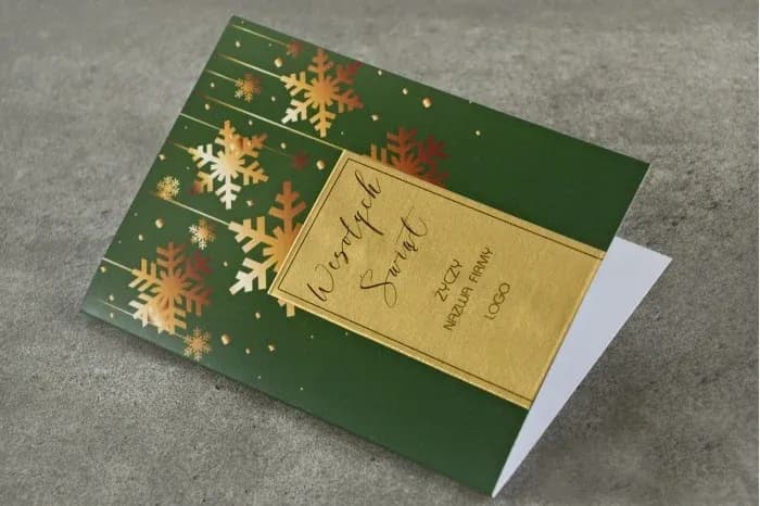 Podkreśl profesjonalizm swojej marki w okresie świątecznym dzięki ekskluzywnym kartkom biznesowym. Model JZ4 to synonim elegancji – głęboka, butelkowa zieleń tła idealnie komponuje się z lśniącymi, złoconymi śnieżynkami i subtelną ramką, tworząc wyrafinowany design. Wykonane na grubym, satynowym papierze 350g, gwarantują niezapomniane wrażenie. Oferujemy pełną personalizację z logo Twojej firmy oraz darmowy projekt z nielimitowanymi poprawkami. Zadbaj o relacje z klientami i partnerami, wysyłając im życzenia, które świadczą o najwyższych standardach. Zamów już dziś!