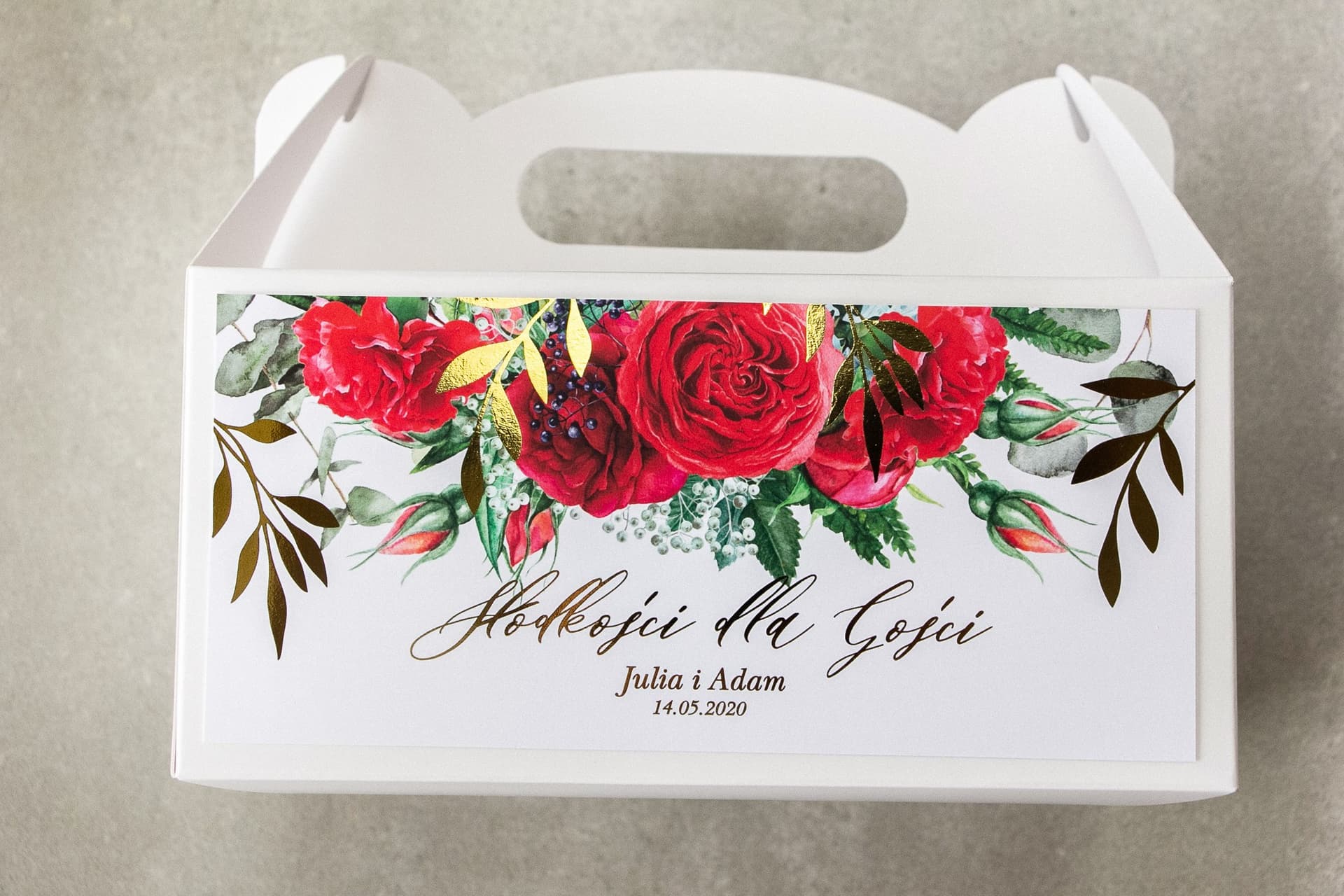 Zakończenie przyjęcia weselnego to moment pełen emocji, kiedy żegnacie się z najbliższymi, dziękując im za wspólną zabawę. Tradycja wręczania gościom słodkiego upominku na drogę jest pięknym gestem, który pozostawia dobre wspomnienia na dłużej. Pudełka na ciasto z kolekcji Rubin nr 8 to idealna oprawa dla weselnych wypieków, łącząca w sobie funkcjonalność z luksusowym designem. Głęboka, nasycona czerwień bordowych róż spleciona ze szlachetnym złoceniem tworzy kompozycję, która doskonale wpisuje się w stylistykę wesel glamour oraz uroczystości organizowanych w sezonie jesienno-zimowym.