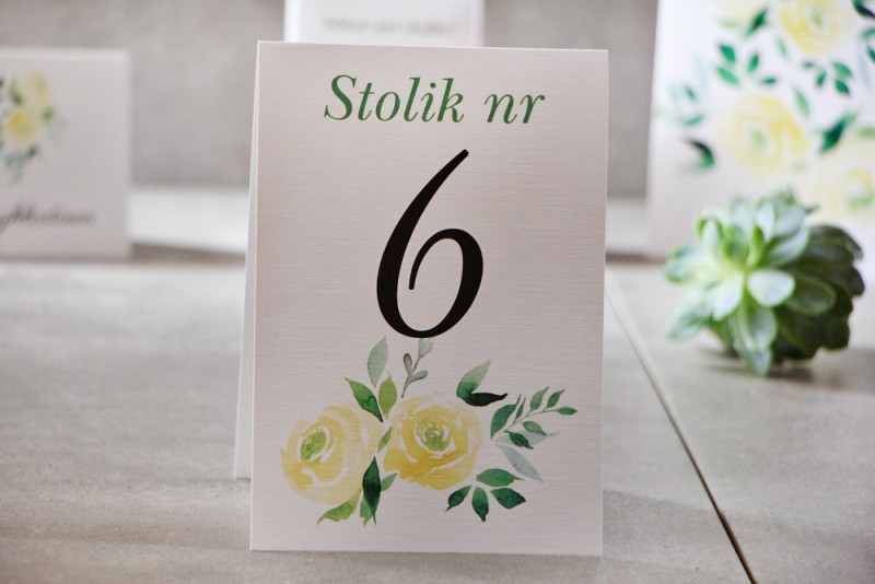 Wprowadź na swoje przyjęcie weselne nutę romantycznej elegancji dzięki numerom na stół z kolekcji Pistacjowe. Subtelny motyw jasnożółtych, akwarelowych róż z akcentami zielonych listków, wydrukowany na luksusowym papierze z fakturą lnu, pomoże Twoim gościom z łatwością odnaleźć swoje miejsce. Te stojące numerki to nie tylko praktyczne oznaczenie stołów, ale przede wszystkim piękny element dekoracyjny, który podkreśli wyjątkowy charakter uroczystości. Skorzystaj z naszego kreatora online i stwórz spójną papeterię ślubną – darmowy projekt i nielimitowane poprawki to nasz standard!
