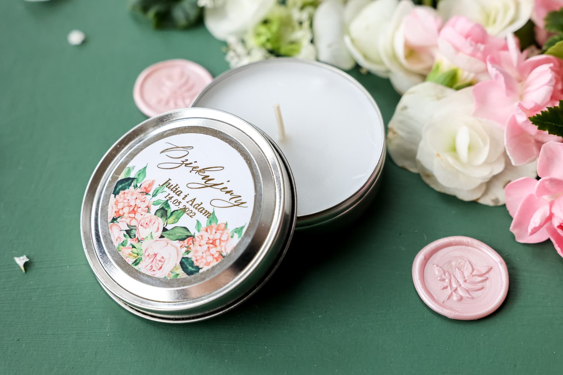Motyw przewodni Waszej uroczystości powinien być widoczny w każdym detalu. Jeśli planujecie wesele inspirowane romantyzmem i luksusem, połączenie pudrowego różu kwiatów ze szlachetnym błyskiem złota będzie strzałem w dziesiątkę. Na wieczku naszej świeczki znajduje się starannie zaprojektowana kompozycja florystyczna. Różowe piwonie i hortensje symbolizują szczęście i obfitość, a złocone napisy dodają całości prestiżowego charakteru. Taka estetyka sprawia, że świeczka przestaje być zwykłym przedmiotem, a staje się małym dziełem sztuki użytkowej. Więcej o tym, jak ważne są detale w odbiorze przyjęcia, przeczytacie w artykule małe wielkie rzeczy, które tworzą atmosferę ślubu.