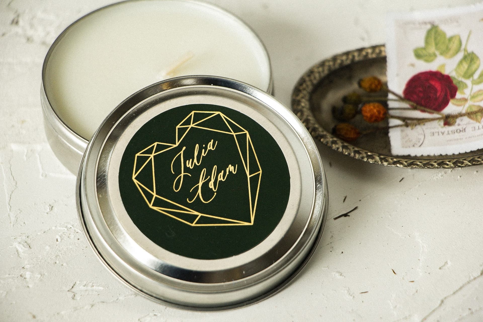 Spersonalizuj swoje świeczki w butelkowej zieleni i złocie. Skorzystaj z darmowego projektu i nielimitowanych poprawek, by stworzyć idealne podziękowania dla gości!