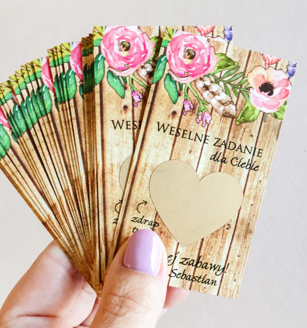 - Romantyczne cytaty i życzenia: Ukryjcie pod zdrapką piękne aforyzmy o miłości lub osobiste podziękowania za przybycie.