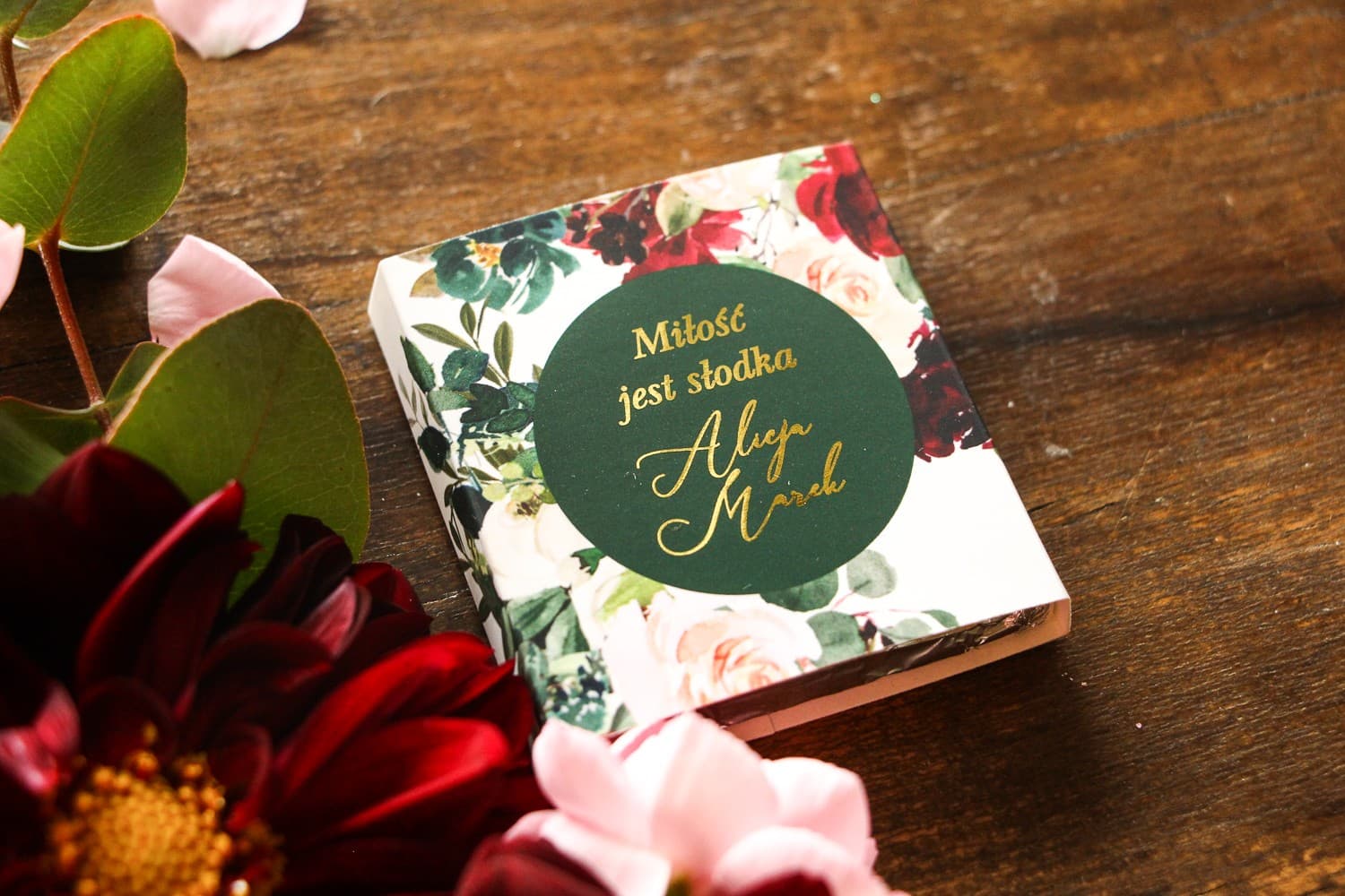 Tym, co wyróżnia nasze czekoladki na tle innych, są starannie wykonane złocone napisy. Ten szlachetny detal dodaje całości luksusowego charakteru i sprawia, że prosty upominek nabiera cech ekskluzywnego prezentu. Błyszczące w świetle złoto idealnie kontrastuje z matową fakturą papieru i głębokimi kolorami kwiatów, tworząc niezwykle efektowny wizualnie produkt. To doskonały wybór dla par, które cenią sobie elegancję i pragną, aby każdy element ich wesela był dopracowany w najmniejszym szczególe. Jeśli zastanawiasz się, jak stworzyć atmosferę luksusu na ślubie, takie detale są kluczem do sukcesu.