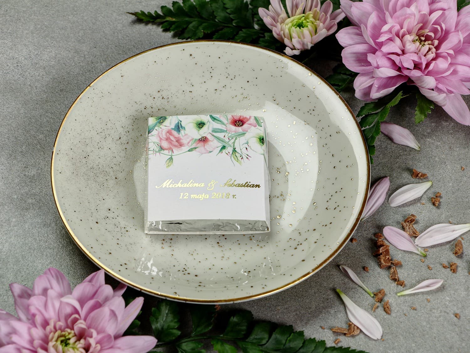 Opakowanie czekoladki zostało zaprojektowane z myślą o najbardziej wymagających gustach. Zdobi je subtelna grafika przedstawiająca delikatne kwiaty eustomy w towarzystwie polnych kwiatów. Taki motyw doskonale wpisuje się w najnowsze trendy ślubne, nawiązując do stylów rustykalnego, boho i romantycznego. Całość nadrukowana jest na wysokiej jakości, sztywnym papierze o gramaturze 250g, co gwarantuje trwałość i nienaganny wygląd upominku. Delikatna, kwiatowa kompozycja sprawia, że czekoladki będą piękną dekoracją stołu weselnego, idealnie komponując się przy nakryciu każdego gościa.