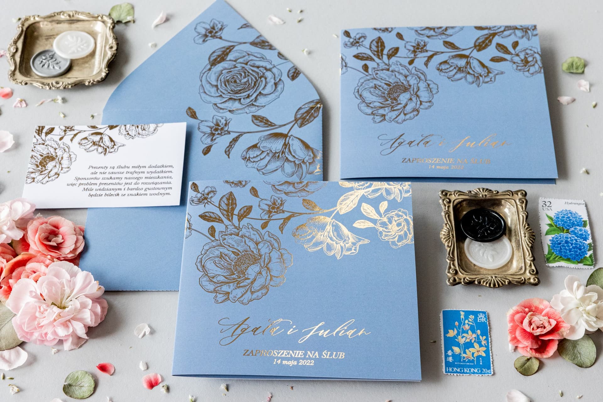 Próbka zaproszenia ślubnego w kolorze dusty blue ze złoconymi kwiatami Onyks nr 2