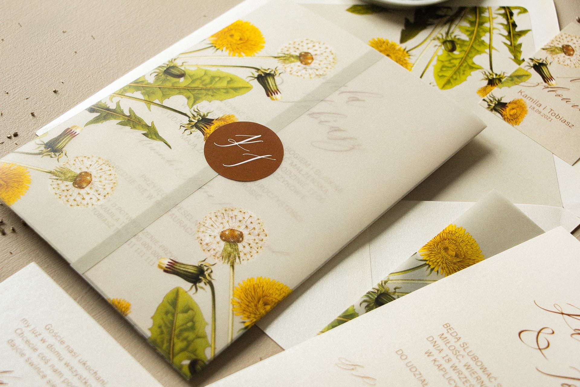 Zaproszenia ślubne perłowe z motywem dmuchawców i owijką z kalki – Opal nr 6
