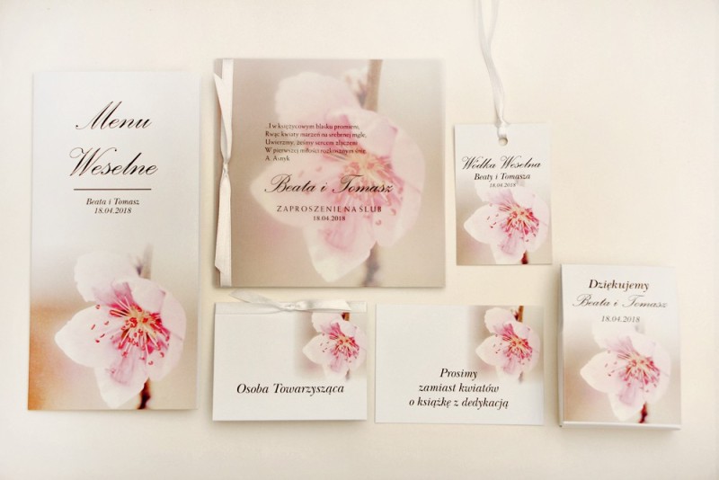 Kolekcja Elegant nr 12 została stworzona z myślą o parach, które cenią sobie elegancję z nutą romantyzmu i nowoczesnego designu. Jej sercem jest delikatny motyw różowego kwiatu wiśni, symbolizującego piękno, ulotność chwili i nowy początek. Grafika ta, wykonana z dbałością o detale, pięknie prezentuje się na wysokiej jakości papierze. Prawdziwym wyróżnikiem tej kolekcji jest jednak zastosowanie półprzezroczystej kalki, która otula główne zaproszenie, tworząc niezwykły, warstwowy efekt. To połączenie klasyki i najnowszych trendów, które zachwyci Waszych gości. Zamawiając próbki, możecie na własne oczy zobaczyć, jak światło przenika przez kalkę i jak detale wzoru prezentują się w rzeczywistości. O spójności papeterii z całością dekoracji możecie przeczytać na naszym blogu w artykule 'Jak zadbać o spójność stylu zaproszeń z dekoracją weselną?'.
