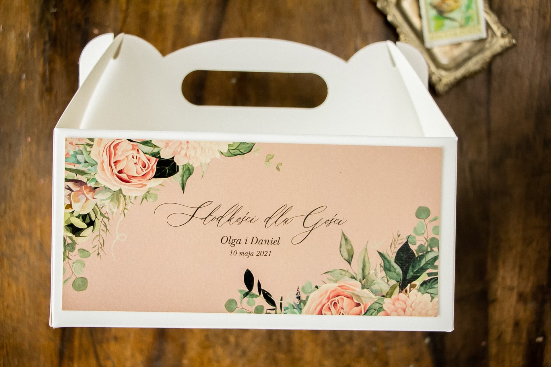 Szukacie wyjątkowego sposobu, by podziękować gościom? Nasze prostokątne pudełka na ciasto weselne z kolekcji Topaz to idealne rozwiązanie. Utrzymane w modnym stylu boho, z subtelnym motywem różowych piwonii, stanowią piękne i praktyczne podziękowanie. Wykonane z certyfikowanego, grubego kartonu, gwarantują bezpieczeństwo słodkości. Oferujemy pełną personalizację tekstu – stwórzcie opakowania idealnie dopasowane do Waszego wesela. Zamówcie już dziś i zachwyćcie swoich gości eleganckim detalem, który na długo pozostanie w ich pamięci.