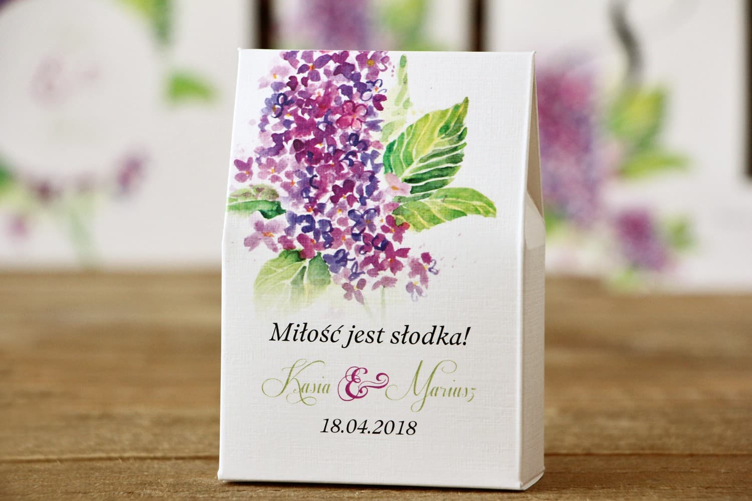 Wyobraź sobie stół weselny udekorowany detalami, które tworzą spójną, romantyczną całość. Nasze pudełeczka wyróżnia zjawiskowy motyw fioletowych kwiatów bzu, naniesiony techniką przypominającą delikatne pociągnięcia pędzla akwarelowego. Fiolet, kolor kojarzony z luksusem, magią i duchowością, w połączeniu z motywem bzu symbolizującym pierwszą miłość i niewinność, tworzy kompozycję idealną na ceremonię ślubną. Grafika jest pełna lekkości i artystycznego wyrazu, co sprawia, że pudełeczka doskonale wpisują się w wesela w stylu romantycznym, boho, rustykalnym czy klasycznym.