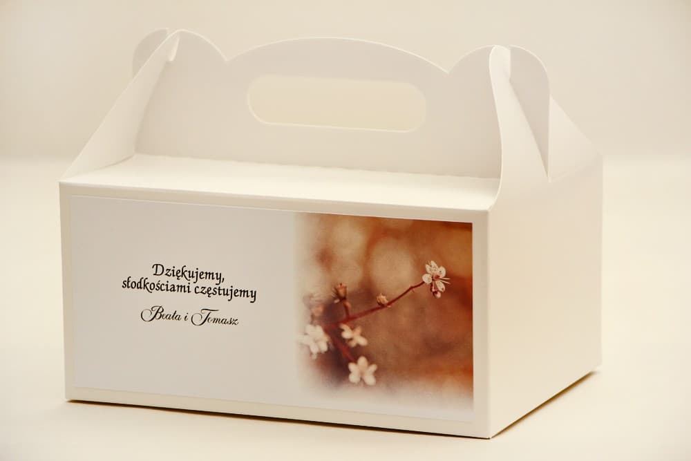 Podziękujcie gościom weselnym w sposób pełen klasy, wręczając im słodkości w naszych eleganckich pudełkach na ciasto. Subtelny, pastelowo-beżowy wzór z drobnymi kwiatami jabłoni doda Waszej uroczystości romantycznego charakteru. Te prostokątne opakowania z wygodną rączką są nie tylko piękne, ale i wyjątkowo praktyczne. Wykonane z grubego, atestowanego kartonu, gwarantują bezpieczeństwo wypieków. W Amelia-Wedding.pl zapewniamy pełną personalizację nadruku z darmowym projektem i nielimitowaną liczbą poprawek, aby stworzyć opakowanie idealnie dopasowane do Waszego stylu. Zamówcie już dziś i zachwyćcie swoich bliskich!