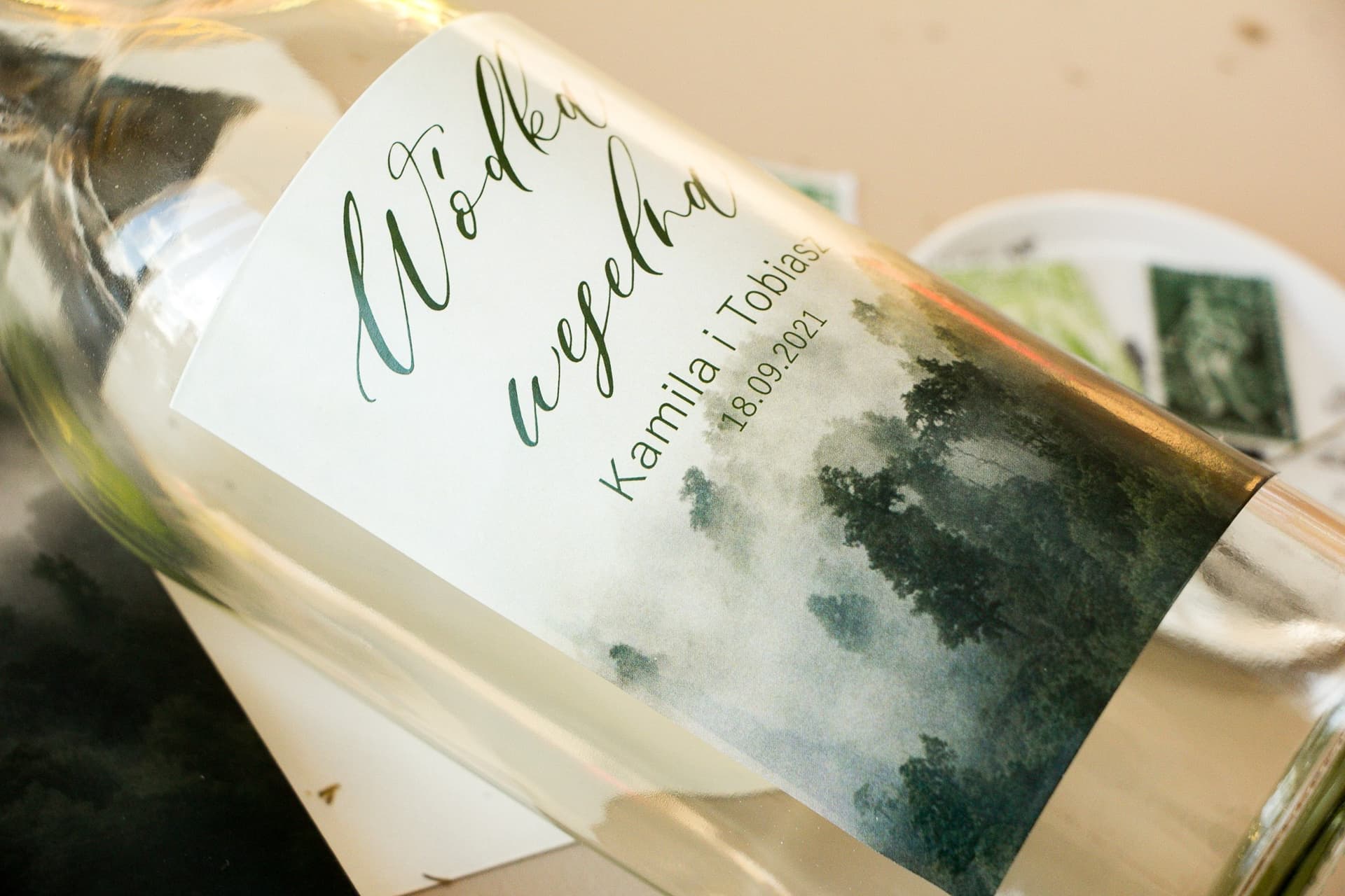 Wyobraźcie sobie przyjęcie weselne, gdzie każdy, nawet najmniejszy element, opowiada Waszą historię. Gdzie goście, sięgając po butelkę, zamiast standardowej etykiety, widzą Wasze imiona i datę ślubu w otoczeniu subtelnej, leśnej grafiki. To właśnie ten poziom dbałości o detale tworzy magię i sprawia, że Wasz dzień jest naprawdę niezapomniany. Prezentujemy etykiety na wódkę weselną z kolekcji Opal nr 2 – małe dzieła sztuki, które zamienią zwykłe butelki w spersonalizowaną dekorację stołu, idealnie wpisującą się w rustykalny, boho czy leśny motyw przewodni.