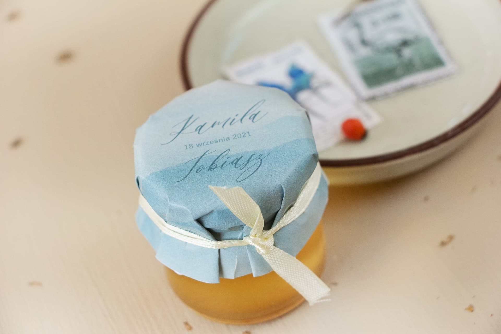 Tym, co wyróżnia miodki Opal nr 4, jest ich unikalny design. Kapturek każdego słoiczka zdobi przepiękna, subtelna grafika wykonana w stylu akwareli. Delikatne, rozmyte barwy i artystyczny charakter malunku przyciągają wzrok i nadają upominkowi niezwykłej klasy. Taki design jest nie tylko modny, ale i uniwersalny – doskonale wpisuje się w klimat wesel w stylu rustykalnym, boho, klasycznym czy romantycznym. Każdy słoiczek, przewiązany starannie dobraną satynową tasiemką, staje się małym dziełem sztuki, które pięknie zaprezentuje się na weselnym stole, tuż obok nakrycia każdego gościa.