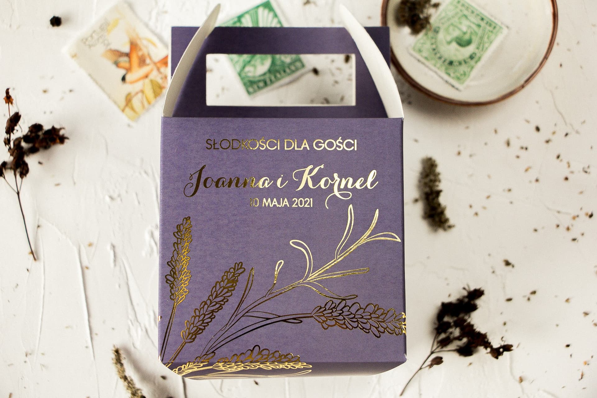 Eleganckie podziękowanie w lawendowym stylu: Pudełka na ciasto weselne ze złoceniem