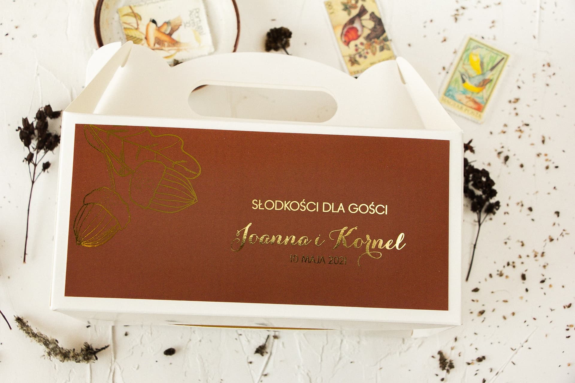 Spersonalizujcie swoje pudełka na ciasto weselne z motywem żołędzi. Skorzystajcie z naszego kreatora lub pomocy grafika i stwórzcie projekt marzeń. Pamiętajcie, projekt i poprawki są u nas zawsze darmowe!